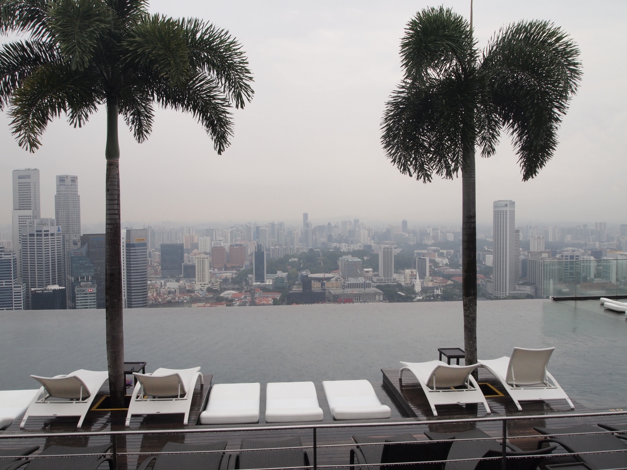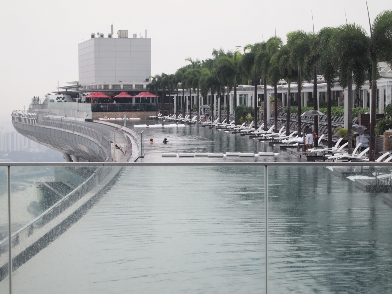 シンガポール滞在最後の日、雨の中にも拘わらず行ってきました。さすがに人は少なく、泳いでいるのは3人だけ。私も泳いでみましたけど、プールの端っこは別に怖くはないですね。錯覚を利用して断崖絶壁になっているかのように見せているだけです。天気が良かったら最高でしょう。