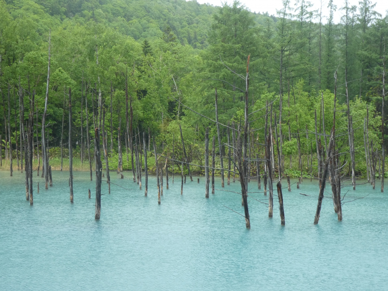 ツアーのコースに組まれているので観光客でにぎわっています。青い池と立ち枯れたカラマツが幻想的な雰囲気を醸し出しています。天候などによって青かったり緑っぽかったり日によって違うそうです。なんでも美瑛川の河川工事の結果、森の中に水が溜まってできたそうです。なので国土地理院の地図では水たまり扱いなので載ってないそうです。お土産は近くの道の駅「白金ビルケ」で青い池に因んだものを色々売ってました。