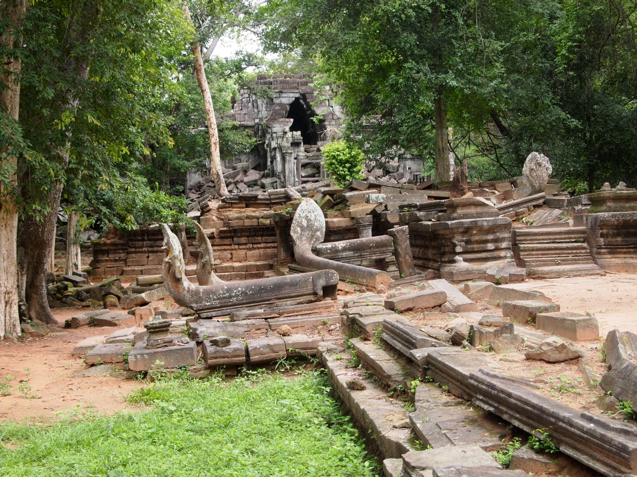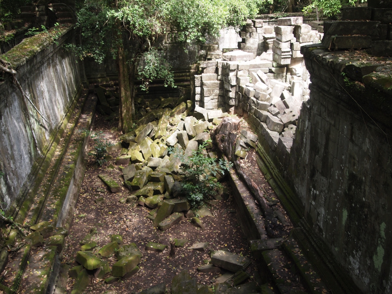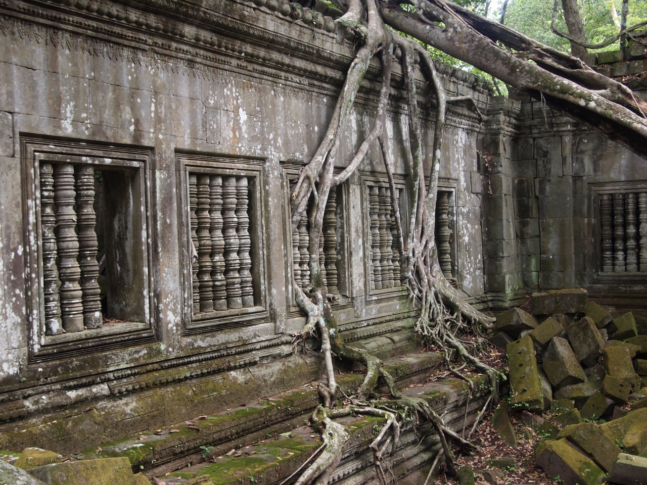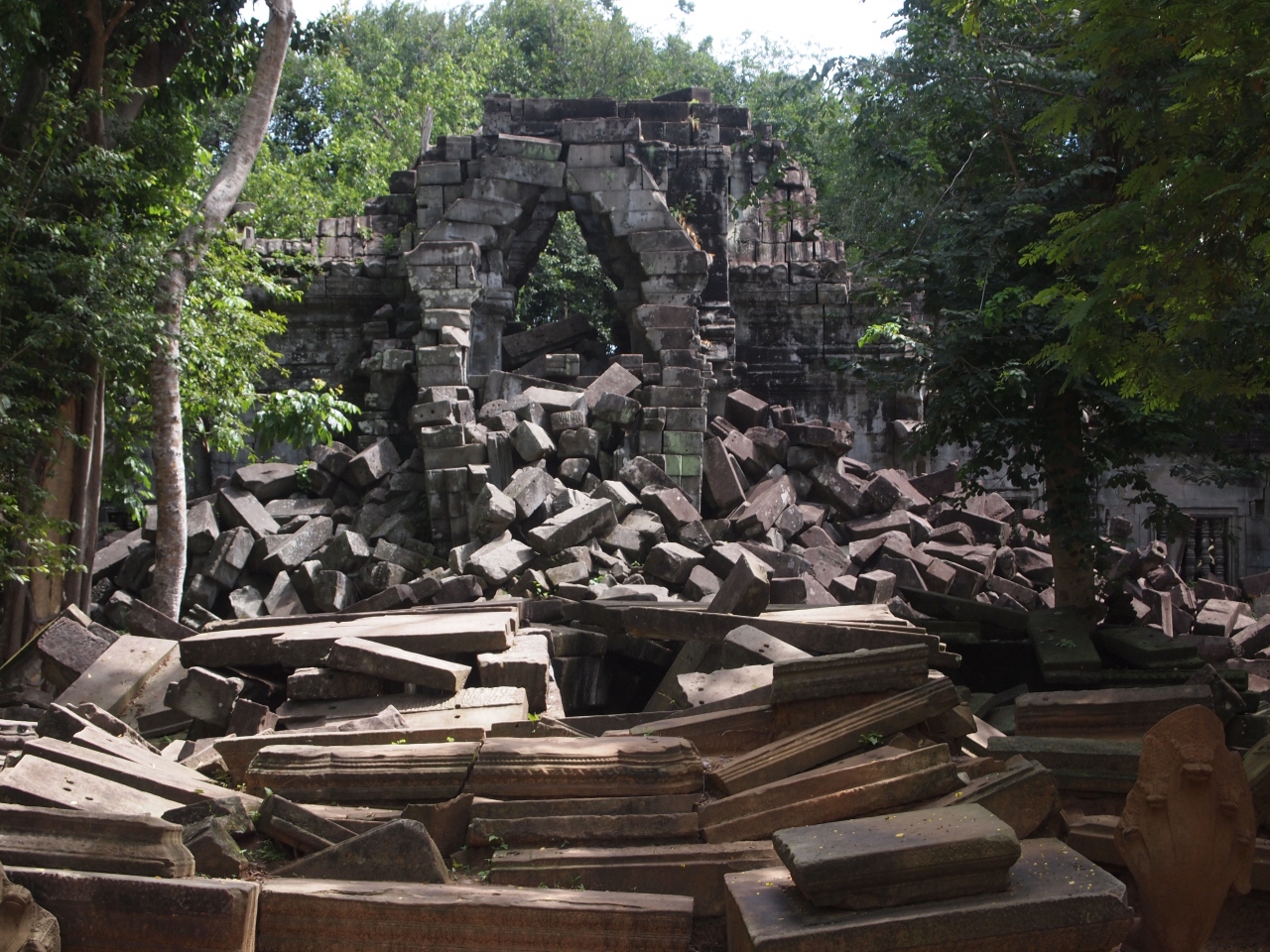 シェムリアップからトゥクトゥクで1時間半で到着。環濠を渡り、林の中を行くとやがて半ば崩壊した塔門が見えてきます。内部に入ると、いたるところが崩壊していて、その上を歩いたり塀の上を通ったりと探検隊かアスレチック場のようです。案内をしようとする子供たちを適当にあしらいながら見て回ります。辺り一面緑の苔に覆われその美しさに感動しました。