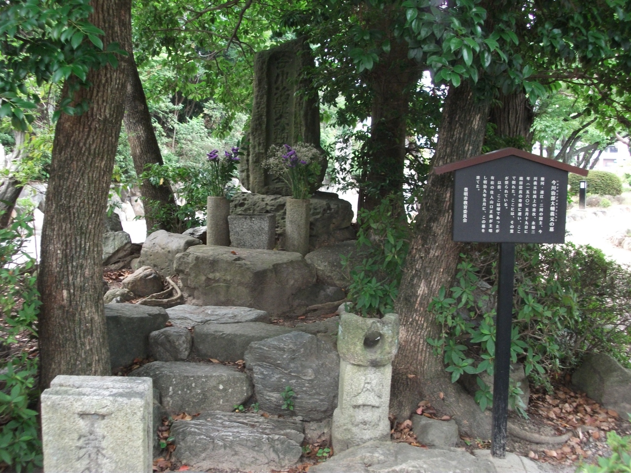 名鉄中京競馬場前駅から国道1号線を横断して100mくらいです。公園のように整備され今川義元の墓を始め江戸時代から明治時代にかけて奉納された石碑などが立っています。すぐ近くに高徳院というお寺があってそちらには今川義元の本陣跡の石碑があります。