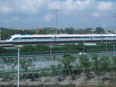 浦東国際空港から上海市内の龍陽路まで約30kmを7~8分で結んでいます。最高時速は430kmだそうですが、私たちが空港から乗った列車は300km/hでした。あまり揺れもなく、車内にある速度計で300kmを超えたかと思ったら減速し、あっという間に終点の龍陽路へ着いてしまいました。一般席は通路を挟んで3・3の座席でした。将来、上海中心部まで延長されればともかく、現状ではあまり利用価値は無さそうですね。