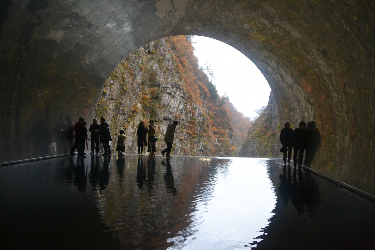 駐車場から川沿いに暫く行くとトンネルの入り口が見えてきます。入場料は一人600円です。トンネルは峡谷と並行していて、途中に3箇所そして終点に1箇所峡谷を見られる見晴所があります。峡谷とエメラルドグリーンの清流の眺めは勿論ですけど、4つの見晴所も面白い工夫があって楽しめます。