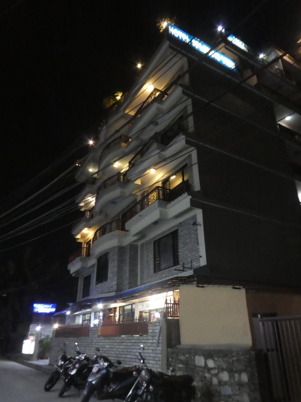 ポカラのレイクサイドの8番の通り。なので、食事や買い物には便のいい立地です。向かい側にはDB MOMOがあるので便利です。通りに面した部屋はベランダ付きなので天気さえよければアンナプルナがよく見える(はず)。オーナーは強面ですけど言ったことはちゃんとやってくれます。