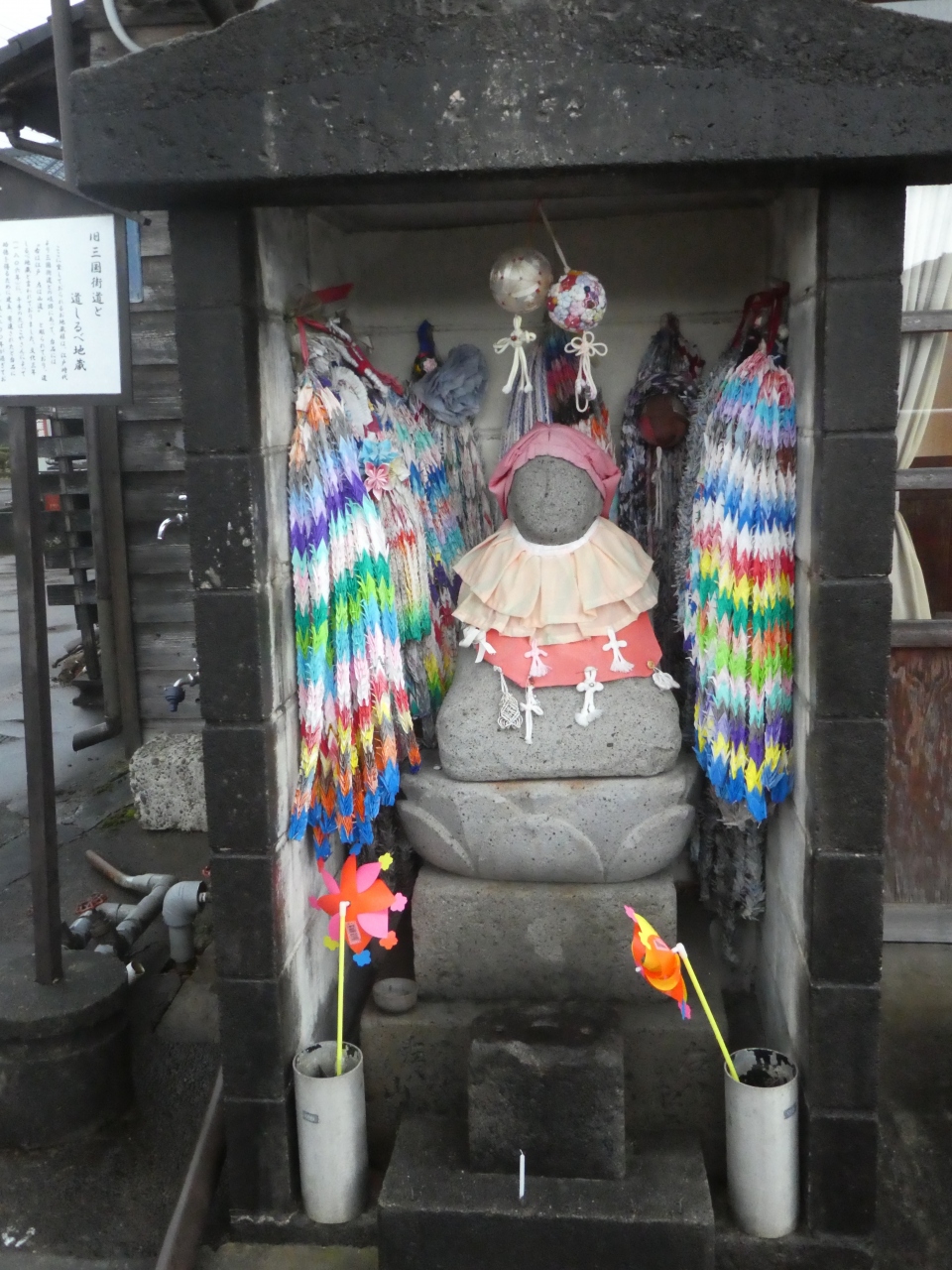 醸造蔵は見学できませんでしたが、店頭でスタッフが説明してくれました。創業は天保二年。180年続く醤油メーカーだそうです。原料は大豆・小麦・塩それに麹だけで、製品になるまで2年余り。店舗の建物は木造ですが、明治か大正といった雰囲気です。こちらのキャラクターであるお地蔵さんが店の前に鎮座されております。