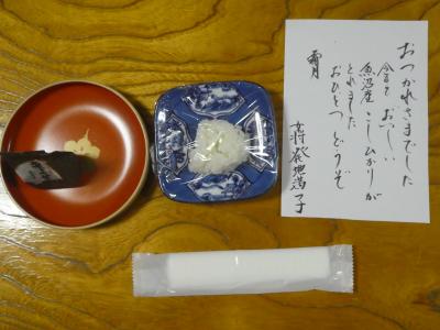 周囲は田んぼだらけなのでとっても静かです。建物は多は少年季の入っているけれど掃除などは行き届いているのでなんの問題もありません。屋上には露店風呂がありゆったりつかることができました。部屋に通されると女将手作りの小粒なコシヒカリのおにぎりがありました。空腹でお風呂に入ると体に良くないということらしいです。
