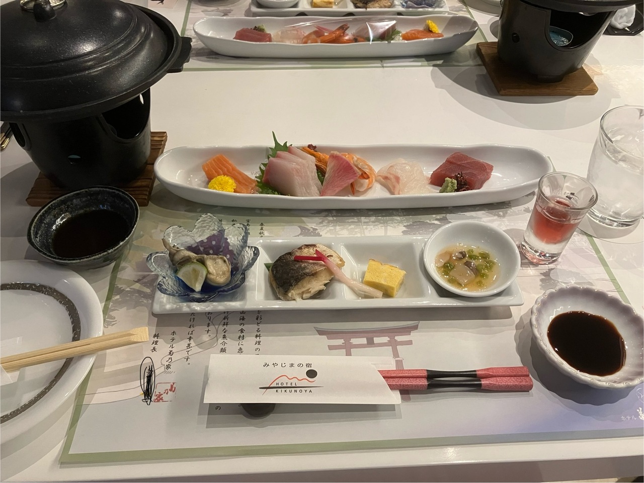 夕食は海老/穴子/カキの釜飯が選べます。焼物がお肉のプランを選びましたが、広島産和牛柔らかくて美味しかったです。他のメニューもとても美味しく、日本酒飲み比べ(3種)をオーダーして楽しめました。過去にはミシュランに掲載されたこともあるようです。