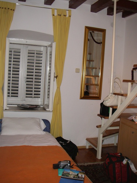 プレッツア大通りから急な坂を3分ほど上がったところにある、Pension Ragusa。専用のサイトからネットで申し込みました。空港で出迎えてもらって(有料30ユーロ/3人)、城壁北側の駐車場まで送ってもらいました。部屋はさすがに狭く、主ベッドのある部屋は頭のつかえそうな屋根裏部屋でしたが、清潔なことと、クーラーがよく効いていた点はOK。なお、このペンションは近くの同名のレストランと同じ経営者で、朝食はそちらでとれます(これはなかなか美味しい)、夕食も宿泊者割引(10%)あり。朝早くから旧市街を散策したい向きにはお勧めの宿です。