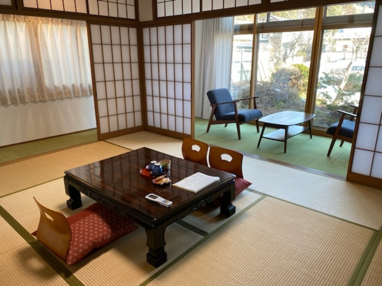 和室2部屋、洋室1部屋付きの広い部屋に2食付き1泊した。夕食バイキングは寿司からステーキまで様々な食事を楽しむことができた。とても美味しく大満足だった。しかたがないとはいえ、ひとつ難点は、部屋から風呂までの距離が遠く、冬なので廊下を歩くのが寒かったことか。