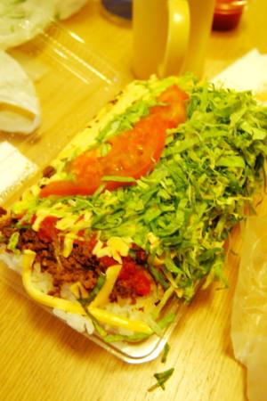 1人前、値段から言ってタコス1~2ピースじゃないかと思いきや5~6ピースあります。しかも1ピースの量(野菜も挽き肉も)かなりのボリュームです。