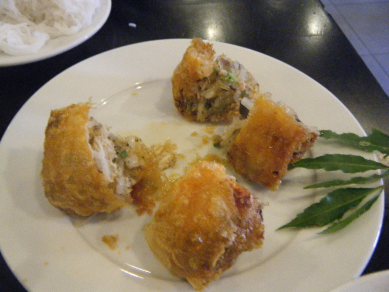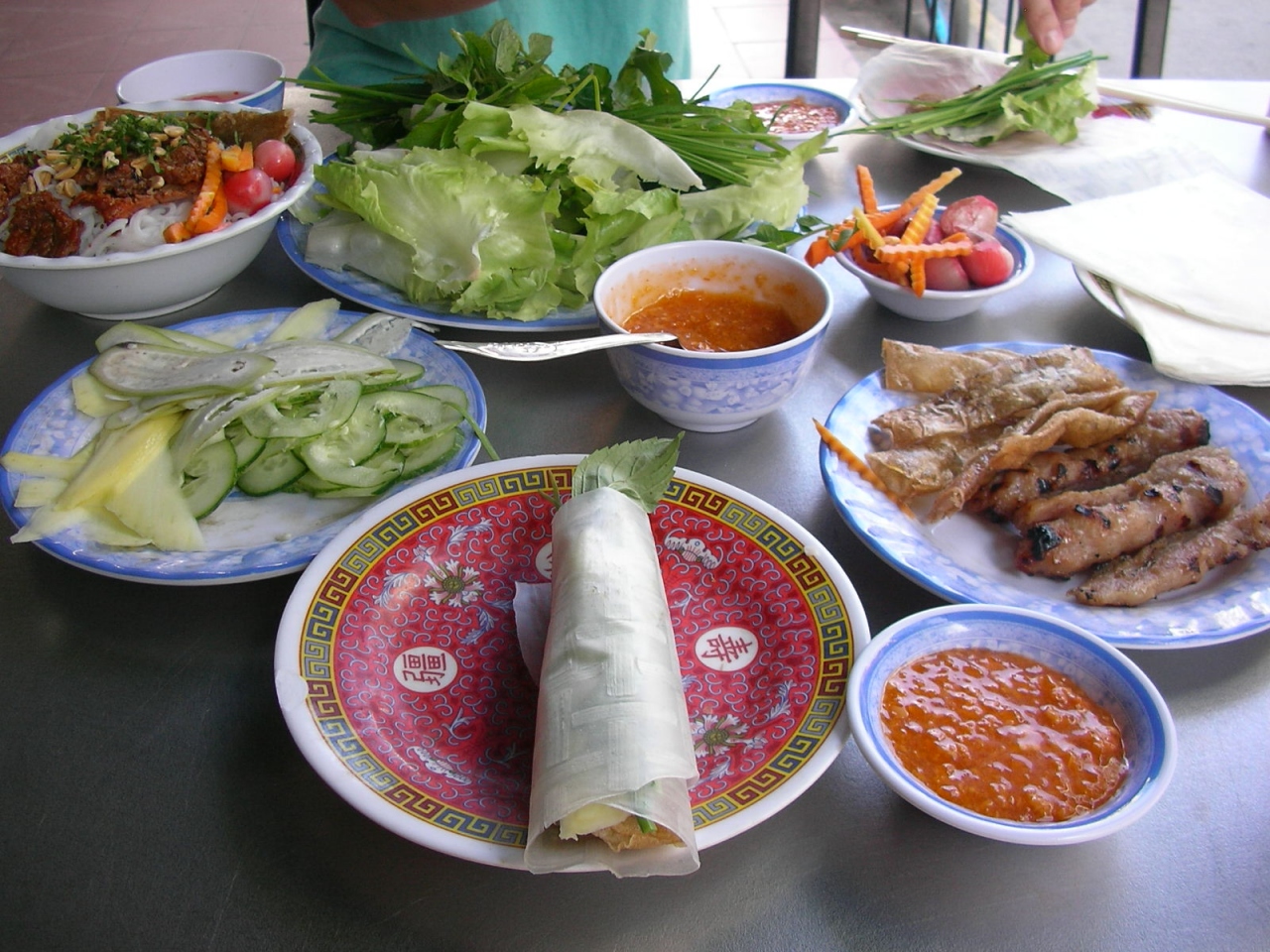 人気メニューは、棒状の肉団子のような物と生野菜・ハーブなどを生春巻きの皮で巻いて、特製のオレンジ色のタレに付けていただきます。