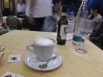 主菜に肉の薄切り、えすかろーべをとって、赤ワインを飲み、さいごにカプチ...