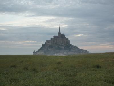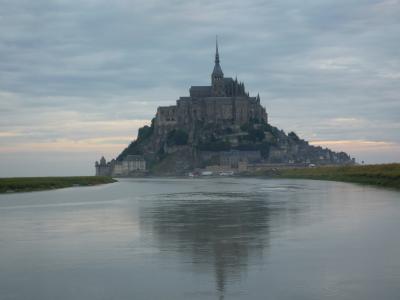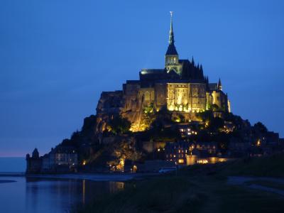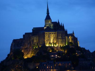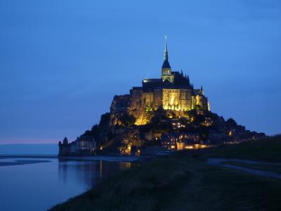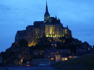 昼間のモンサンミッシェルの観光を終え、当日のホテルは対岸のルレ・サン・ミッシェルだったため、食後ライトアップされたモンサンミッシェルを撮ろうとおもって徒歩ででかけました。しかし、7月のため、なかなか日が暮れず、夜9時を過ぎてからようやく日が暮れ始め、22時30分ごろまで薄っすら明るかったです。- 旅行時期