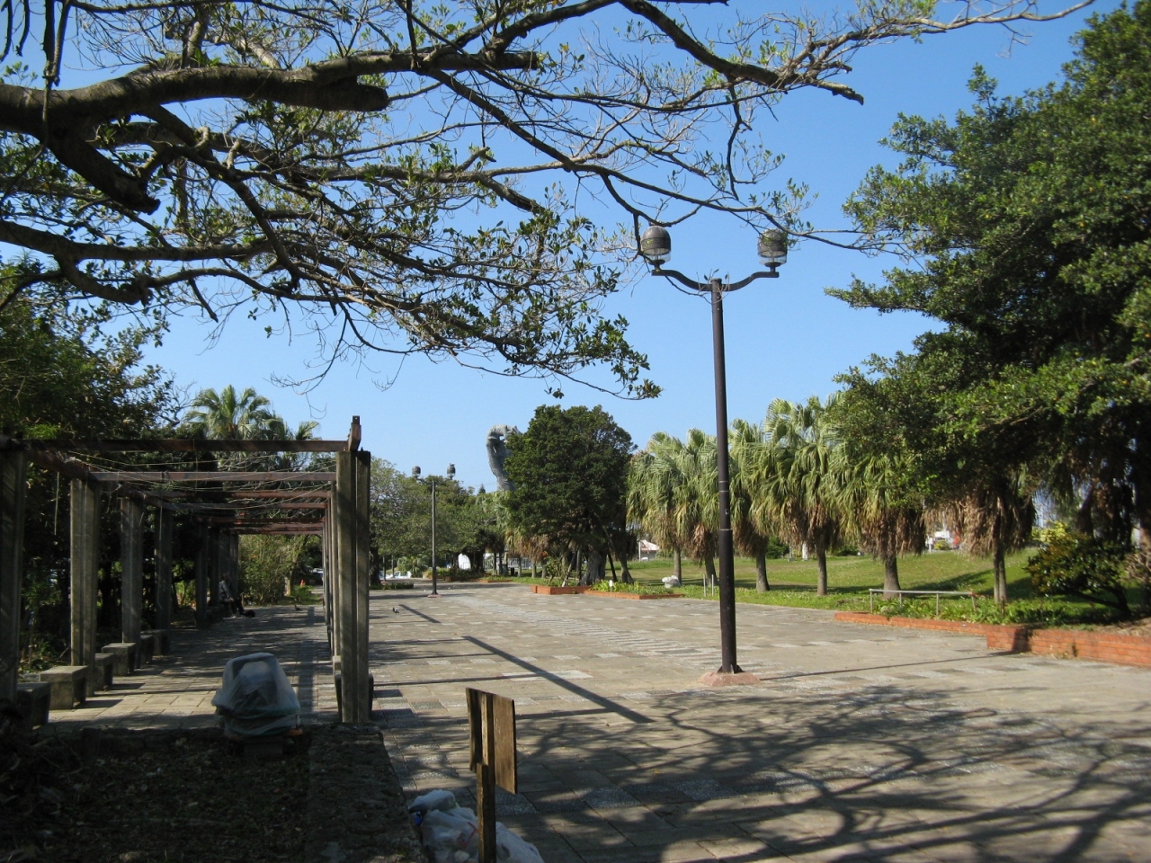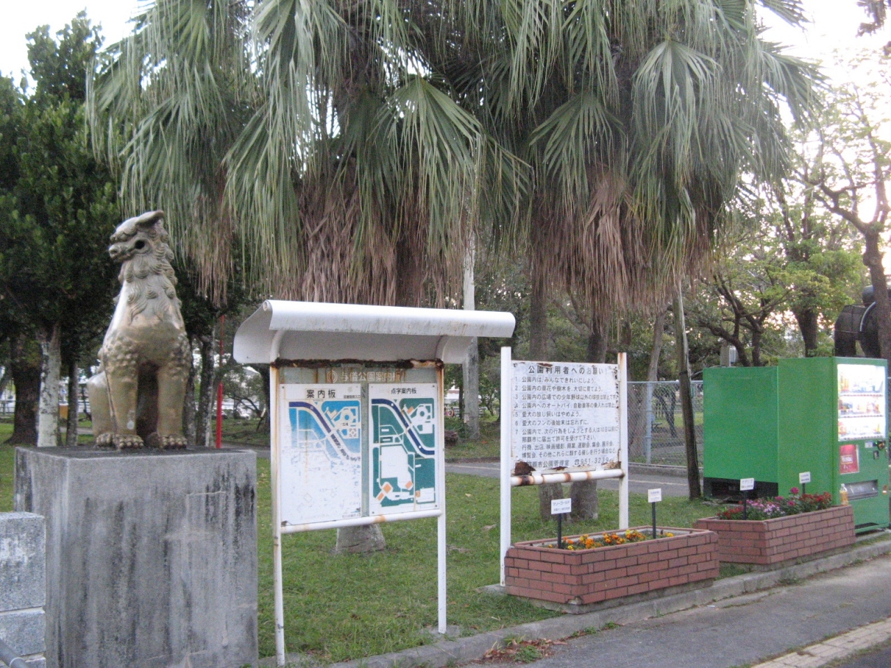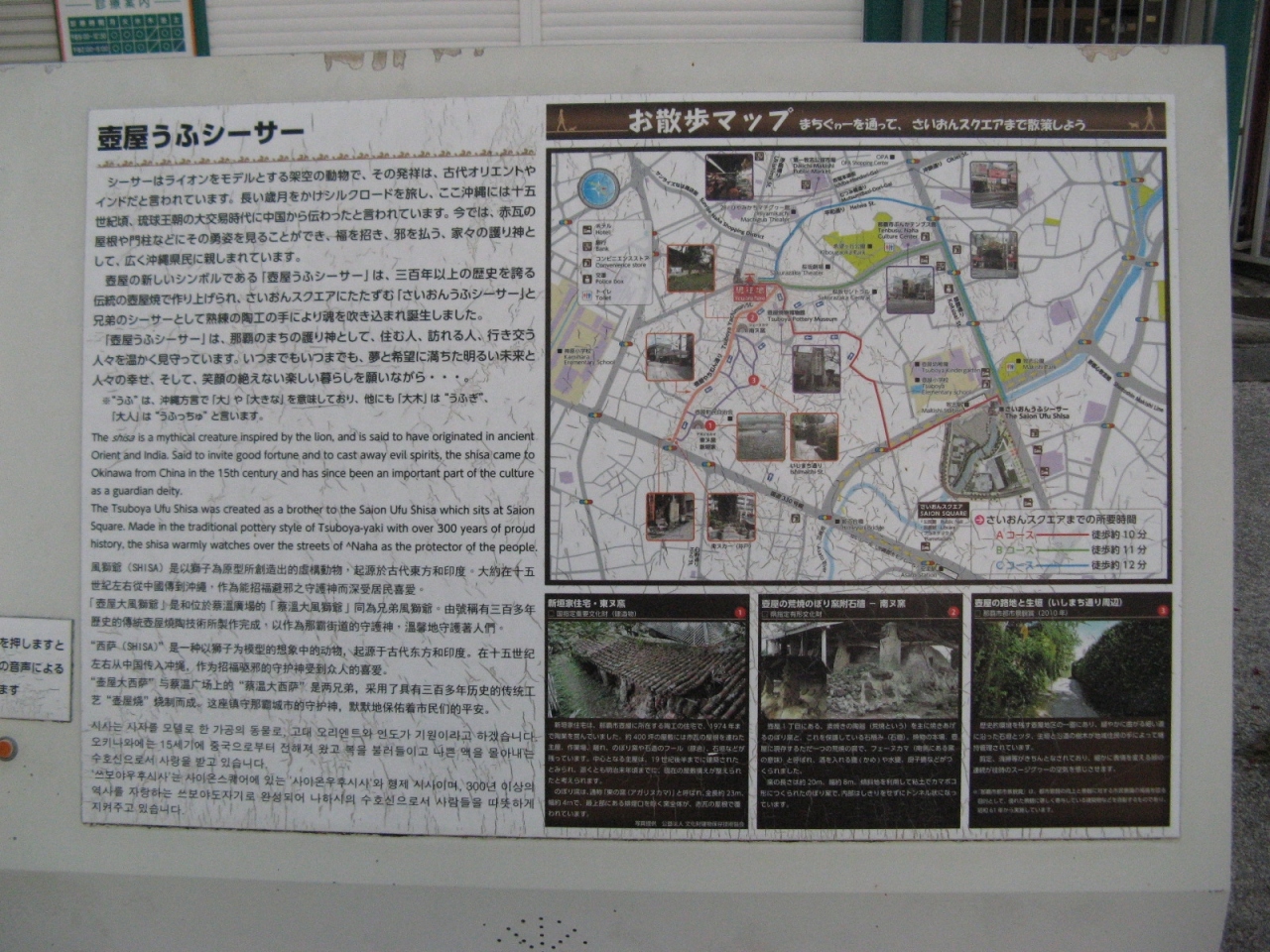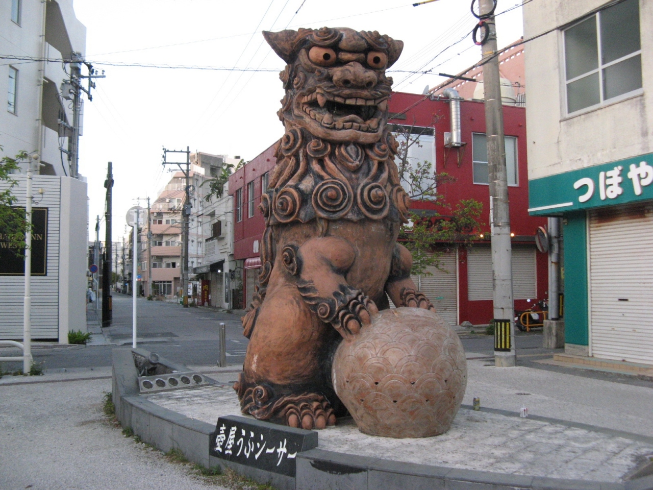 牧志の公設市場から壺屋のやちむんに向かうと入口にあります。壺屋焼きで出来た高さ3mほどもある巨大なシーサーです。現地にあった説明板に『シーサーはライオンをモデルとする架空の動物で古代オリエントやインドが発祥で沖縄には15世紀頃中国から伝わった』とあり、今では福を招き、邪を払護り神として広く親しまれているシーサーの由来を知ることができてよかったです。巨大なシーサーは目を見開いて怖い顔をしていますが、どこか愛嬌もありました。