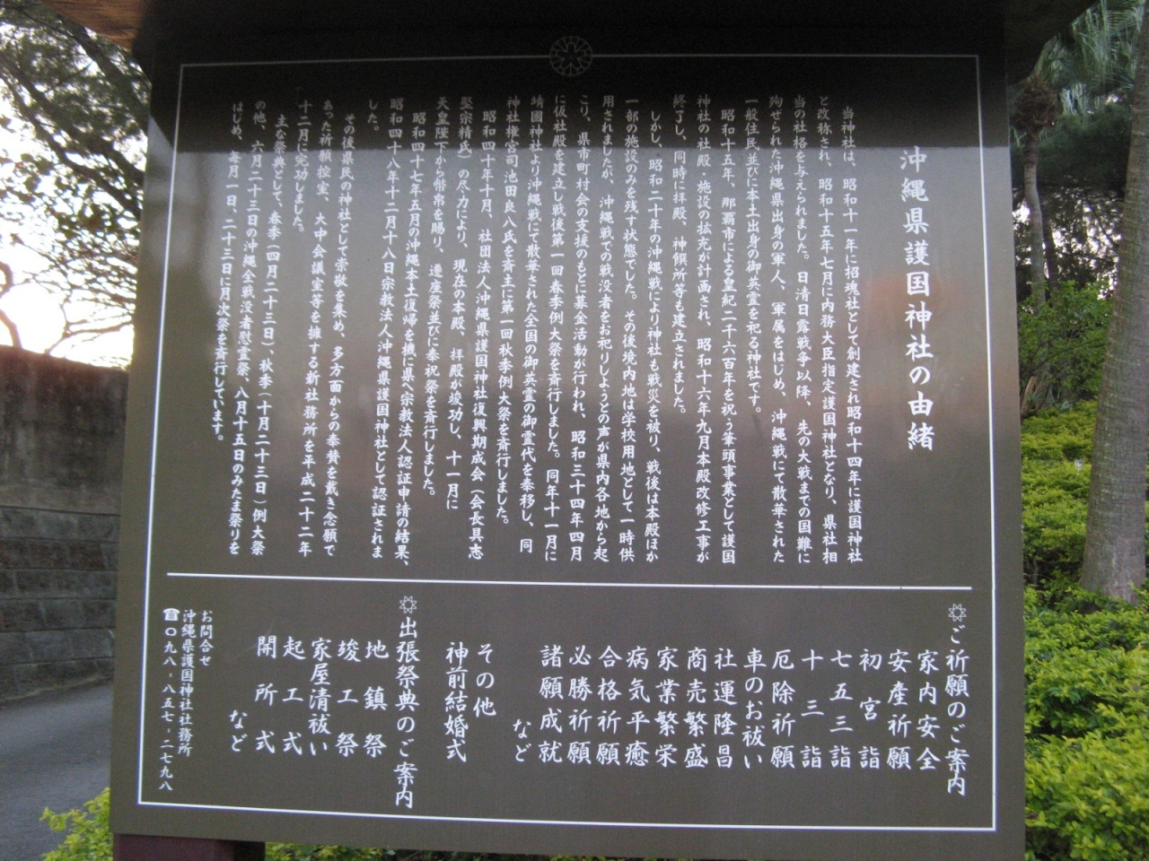那覇市久米の松山公園に隣接してあります。孔子及びその門弟をお祀りされています。綺麗に整えられた芝生の庭の先に建つ大成殿の柱には龍の彫り物があるなど中国風のデザインが目につきますが、赤瓦葺きの屋根を見ると沖縄らしさもあります。無料で拝観できます。