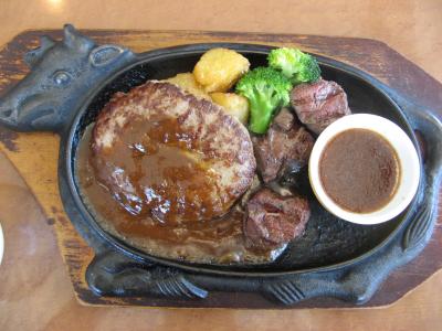 中央環状道路沿い、広い駐車場があって車で行くのが便利です。ステーキやハンバーグなどをメインにするファミレスです。平日にランチに伺いました。ランチメニューの中から“ハンバーグ&カットステーキランチ”を頂きました。サラダバーやスープバー、焼き立てのパンが食べ放題でお腹一杯になりました。外食が多いと野菜不足になりがちですが、サラダバーで新鮮な野菜がたくさんとれるのがいいと思いました。ドリンクバーもつけて2300円弱でしたがコストパフォーマンスが良いと思いました。