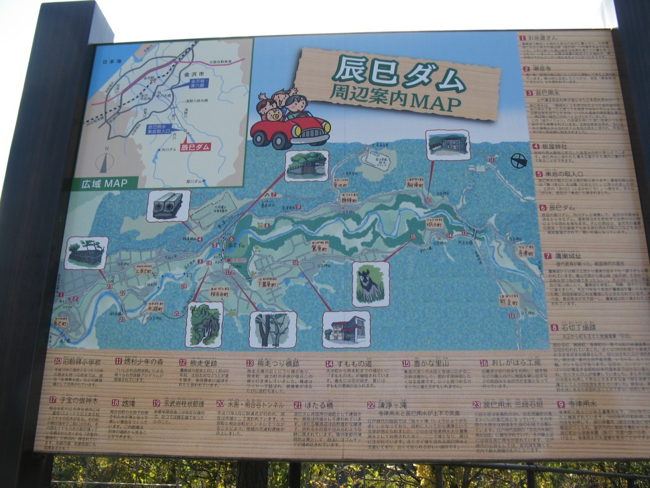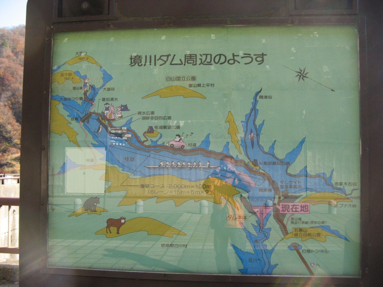 山中温泉から国道364号を車で走って10分あまり、我谷ダムと九谷ダムを訪れた時に観光しました。我谷ダムによって造られた湖は「富士写ケ岳」を背後にすることから“富士写湖”と呼ばれていて、ダム湖の中ほどにかかる長さ140mほどの赤い吊り橋を渡ると2時間足らずで「富士写ヶ岳」の頂上に達することができます。また、我谷ダムの東2km程のところにある九谷ダムのダムサイトに登山口広場と駐車場がありそこから登るルートでは九谷ダムによって造られた五彩湖が綺麗に見えました。