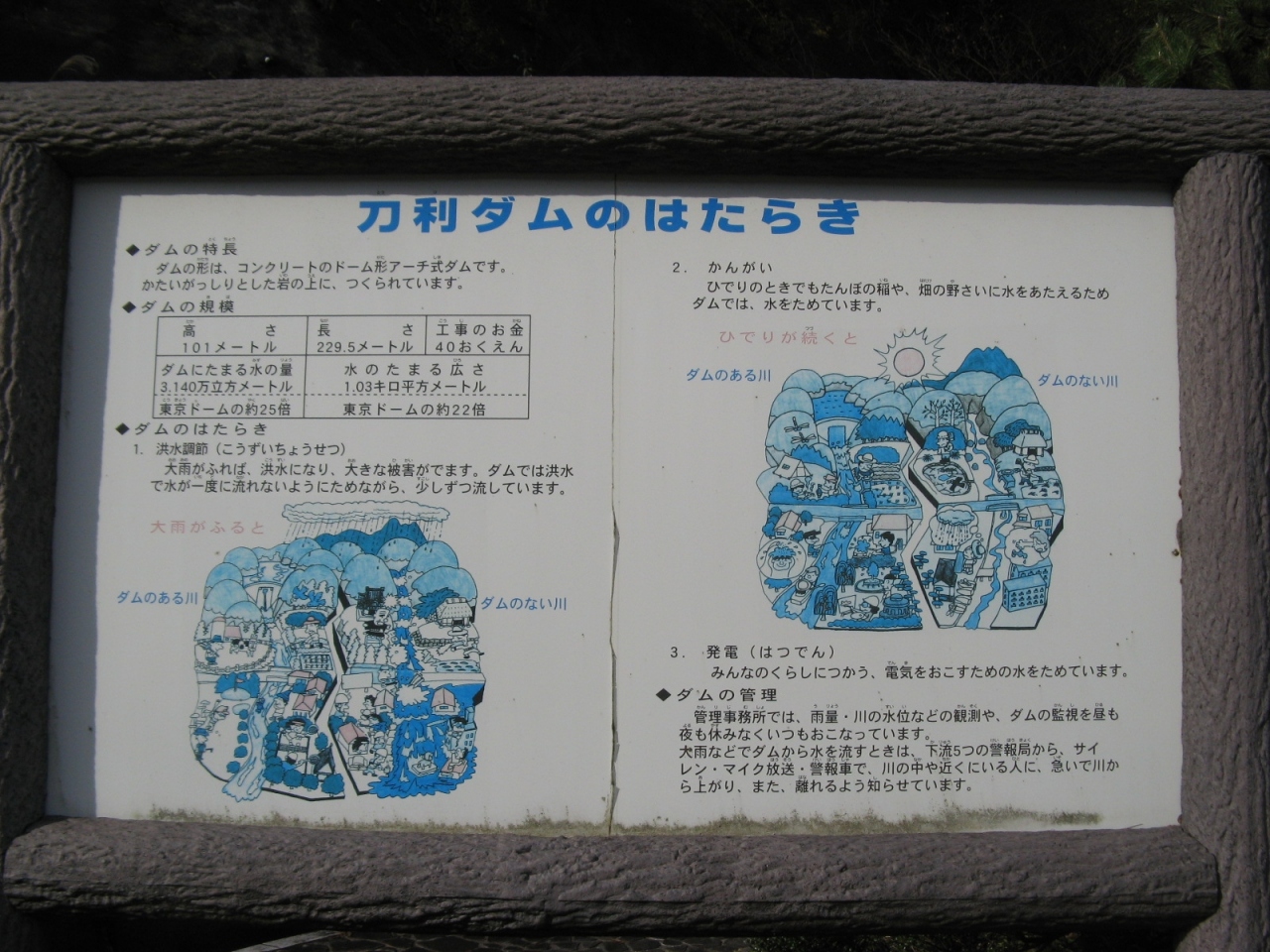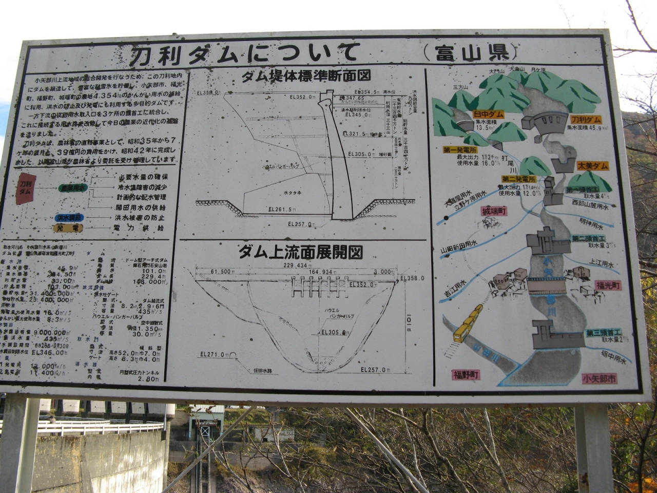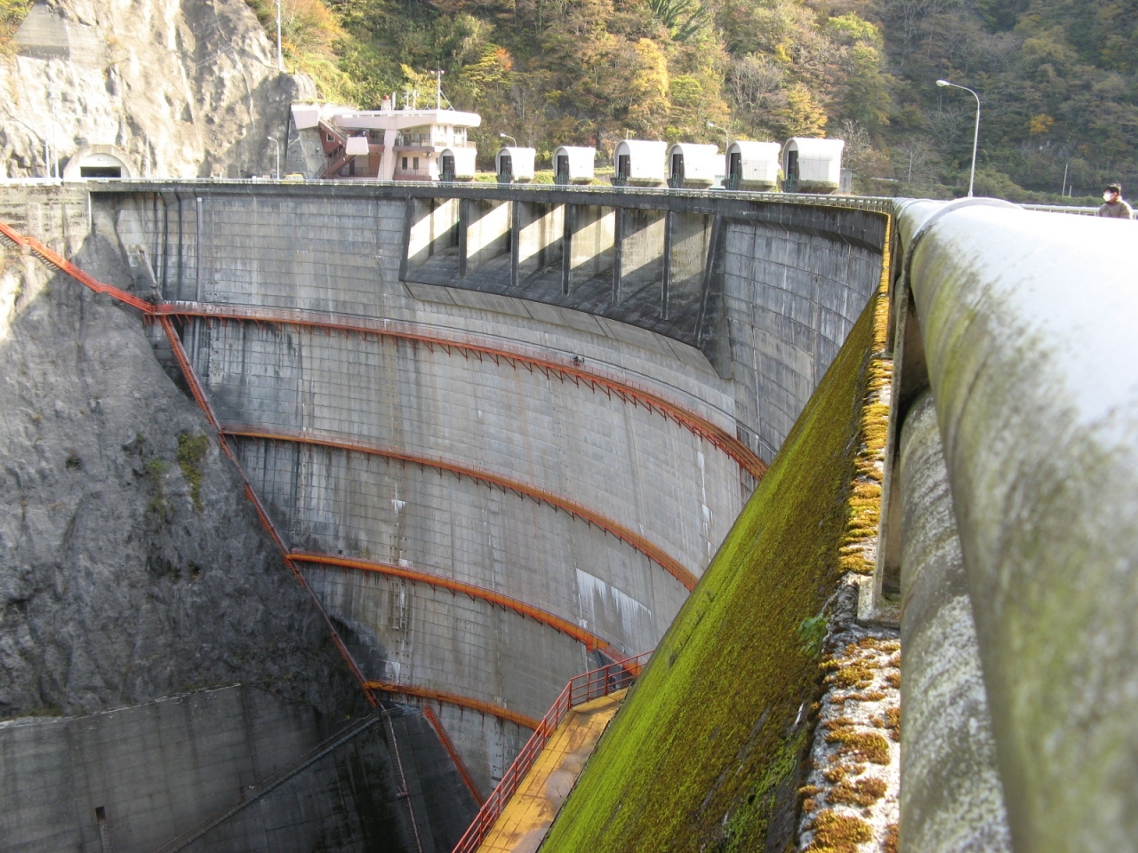 山中温泉に遊んだ時、8年ぶりに再訪しました。1964年竣工という古いダムはスキージャンプ式の減勢工を備えた洪水吐があり、苔むしていて時代を感じます。訪れたのが11月中旬と言うこともあって周辺の山々の紅葉風景と相まってとても風格がありました。ダムカードはダムサイトにある大聖寺川ダム総合管理事務所で頂くことができました。なお、3kmほど上流にある九谷ダムのダムカードも大聖寺川ダム総合管理事務所で頂くことができますので、九谷ダムを訪れた証拠写真を持って行かれることをお勧めします。