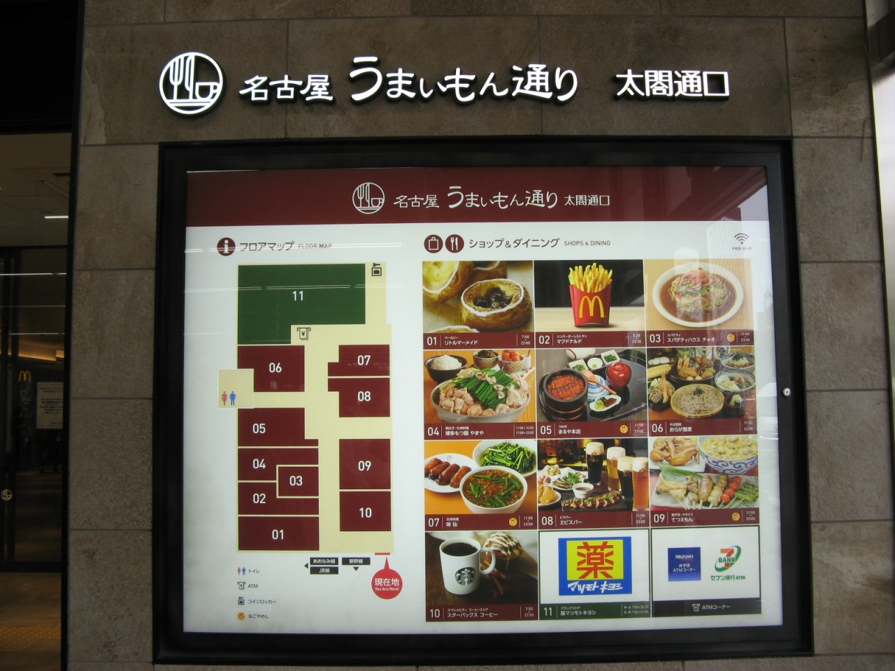 JR名古屋駅の新幹線の改札に近い飲食店街でそれほど広くはありませんが、マクドナルドやスターバックスなどの有名チェーン店はもちろん、ひつまぶしや手羽先、味噌カツ、きし麺など名古屋飯の人気店もあり電車の待ち時間に合わせて利用できるので便利です。