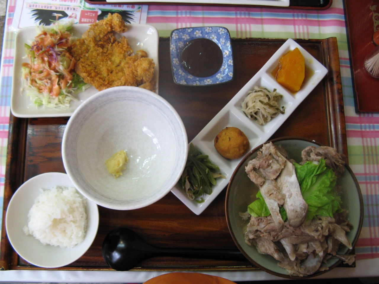 待つこと20分、ドンブリに山盛りの骨汁と4品の小鉢、御飯が到着。沖縄のブランド豚の一つである“紅豚”を使うというこだわりのある骨汁は、しっかり処理されていて臭みも無くてとても美味しかったです。私の定食についていたトンカツも軟らかくてとても美味しかったです。