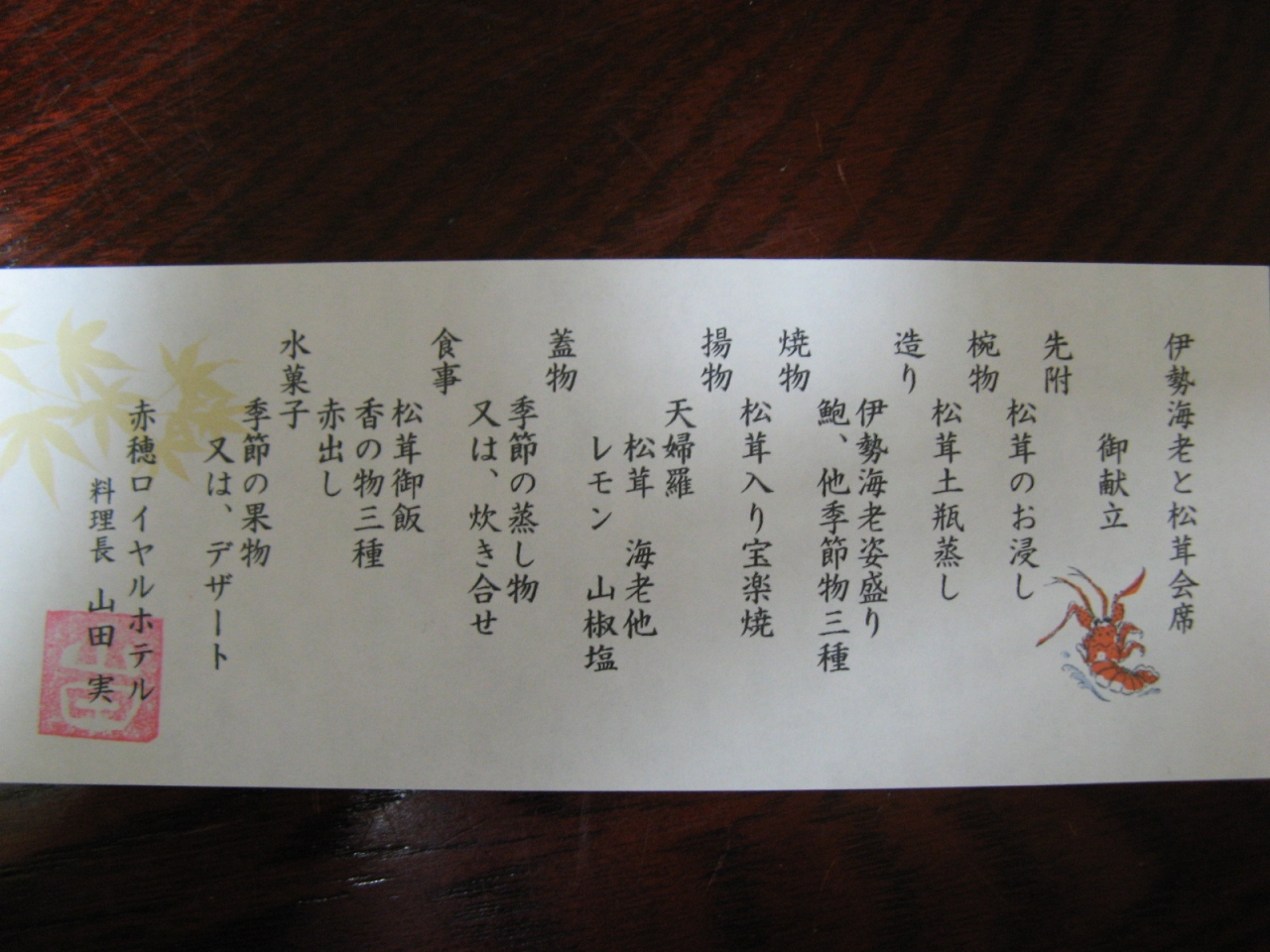 「赤穂ロイヤルホテル」は、赤穂城址のすぐ東という抜群のロケーションにあります。和室に泊めていただいたが、部屋は綺麗で広く、ゆっくりくつろぐことが出来た。夕食は“伊勢海老と松茸会席”で、松茸の御浸し、土瓶蒸し、伊勢海老の姿盛り、鮑ほか刺身三種、松茸宝楽焼、松茸と海老の天麩羅、炊き合わせ、松茸ご飯、デザートなど宿泊費から考えたら十分すぎるほどの内容で、大変美味しかった。赤穂に出かけることがあれば、また、絶対にお世話になりたいと思いました。