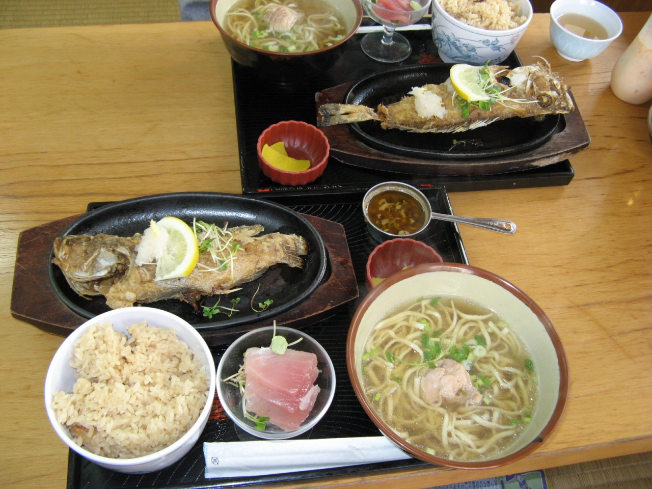 「高良食堂」さんは那覇市若狭の住宅街の中にあります。地元の人やタクシー運転手さんが利用する普通の食堂です。沖縄らしい食堂で、兎に角、安いしボリュームがあります。この日は、家内が“ぐるくんから揚げ”と、私が“魚バターいため”を注文しました。それぞれに、刺身、沖縄そば、ジューシー(炊き込みご飯)が付いてきました。すごいボリュームですが、事前に『ご飯少はうんと少なめに!』と伝えておいたので、何とか美味しく完食できました。