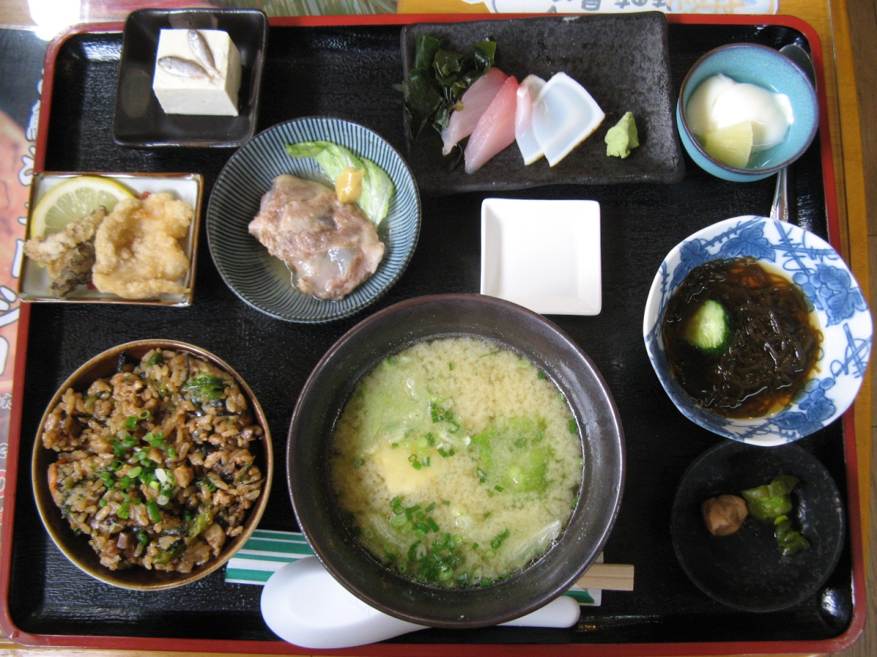 「海産物 えんがん」は那覇市港町、国道58号線の安謝の信号を西に1?ほど入った港のそばにあります。ここは、那覇市の沿岸漁協が直営する食堂で、安く気軽に新鮮な魚が食べられる地元で人気の店です。この日は家内が“うつぼ煮付け定食”、私が“タカセ貝のバター焼き定食”を頂きました。どちらも、小鉢と、汁物がついて1000円、初めて食べる珍しいものでしたが、美味しく頂きました。