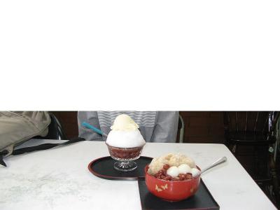 「まるみつ冷やし物専門店 」は、国道331号線の糸満ロータリーを西に向かって糸満市場に向かう途中の道沿いにあります。店に入ると壁を埋め尽くすメニューの札、その大半が“ぜんざい”と“カキ氷”関係で、それだけで50種類ぐらいはありそうです。この日は、私が、“黒糖ぜんざい380円”、家内が“クリームぜんざいマンゴー400円”を注文しました。“黒糖ぜんざい”は黒糖味のかき氷の下に甘く煮た金時豆と白玉が入っていました。“クリームぜんざいマンゴー”の方は、金時豆の上にかき氷とマンゴー味のアイスクリームが乗っていました。どちらも、たいへん美味しく頂きました。