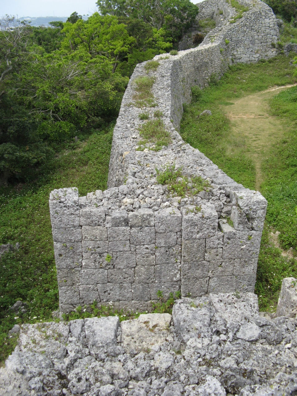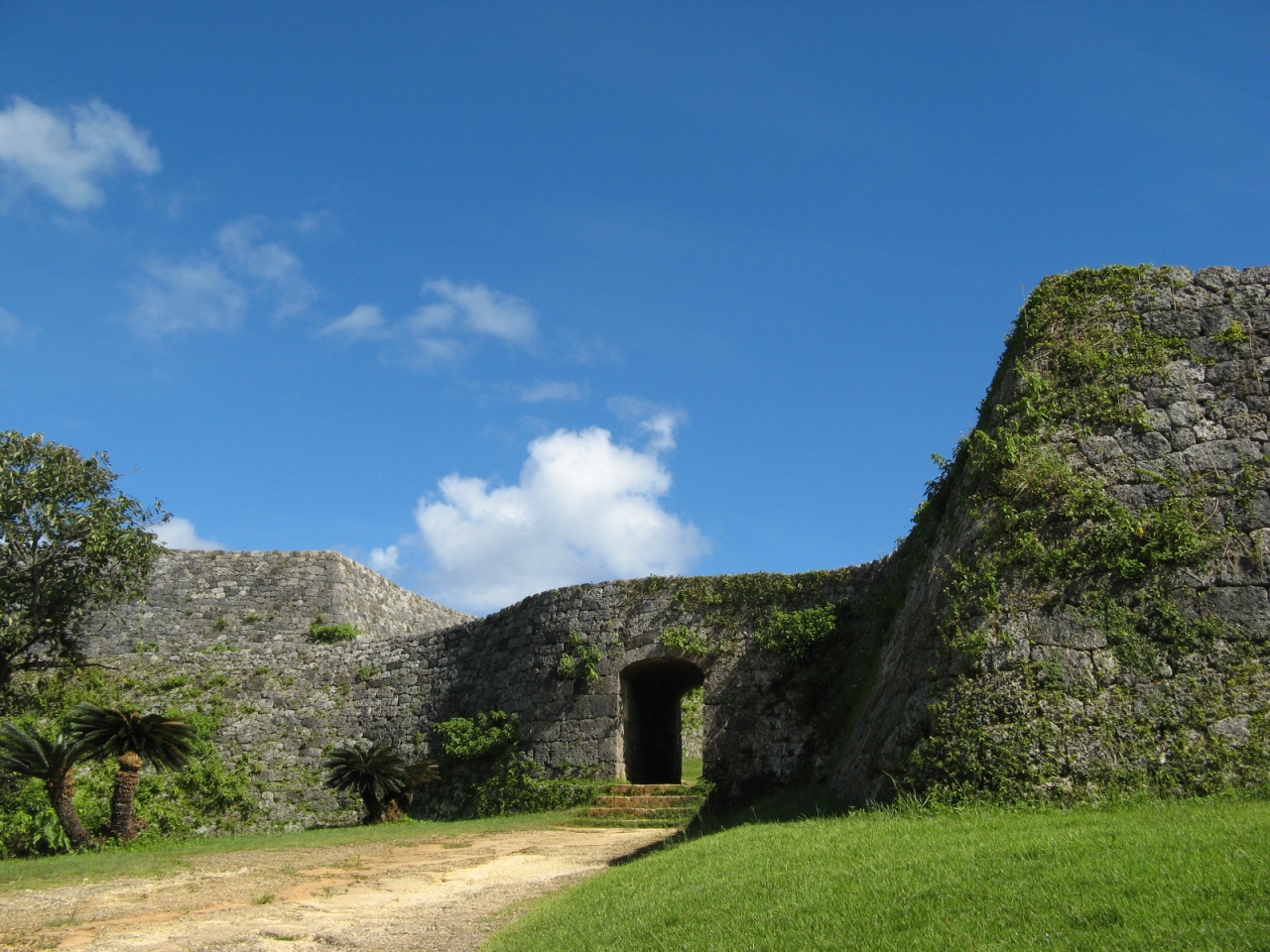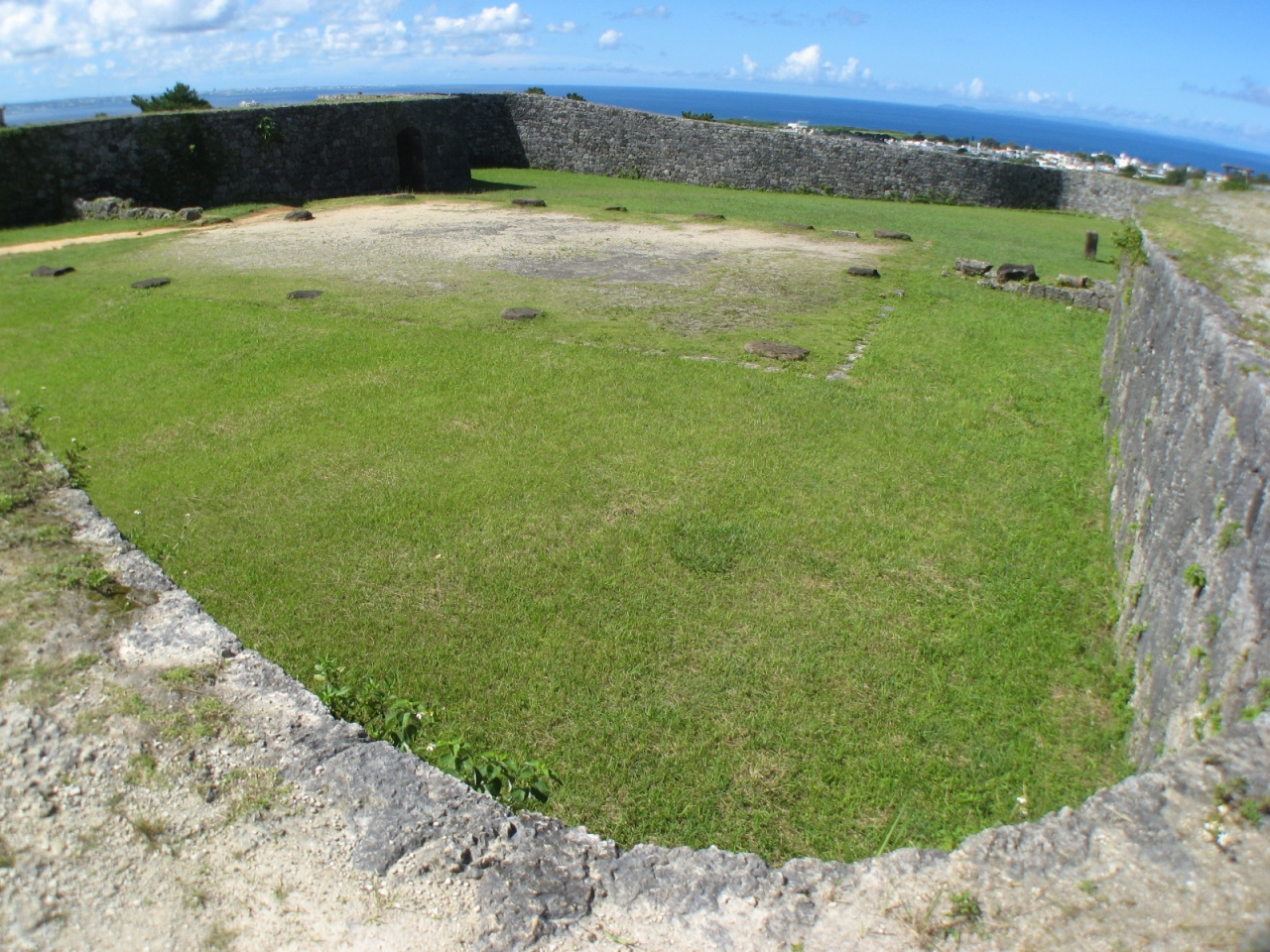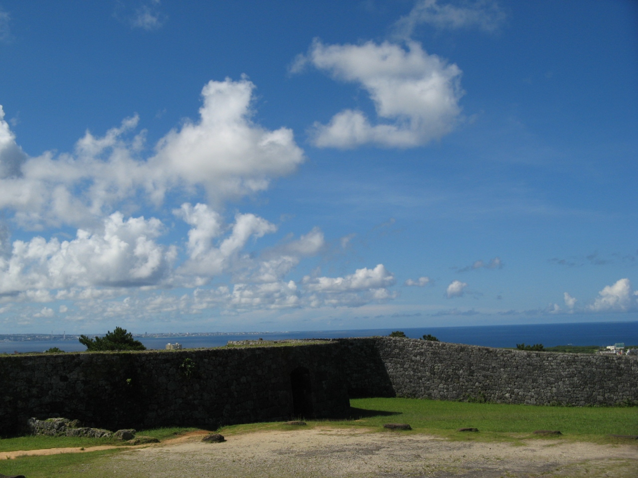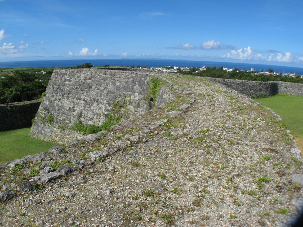那覇から国道58号線を通って車でおよそ1時間、読谷村のほぼ中央に「座喜味城跡」があります。座喜味城は、15世紀初期に築城家として名手だったといわれる護佐丸(ごさまる)によって築かれたと伝えられています。規模はそれほど大きくは無いのですが、石垣のアーチ門や城壁の曲線が見事です。現在、城の頂上は礎石の様なものがあるだけで、広場のようになっていました。頂上からの景色は絶景で、残波岬、恩納村の海岸、遠くは那覇市や慶良間まで見ることができました。近くに来られたら、天気が良ければ、是非、訪問されることをお奨めします。