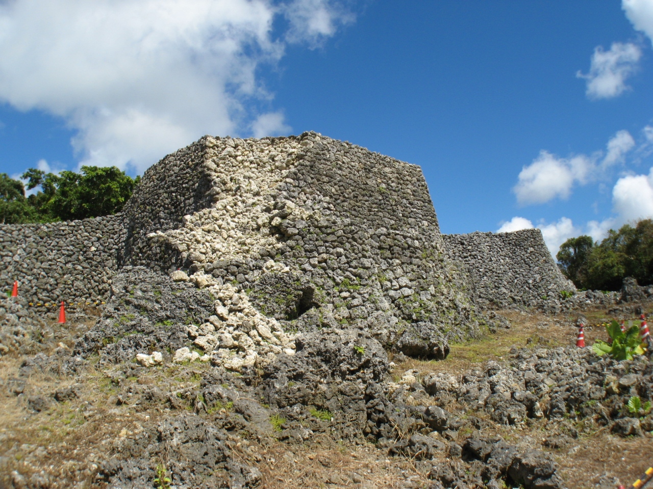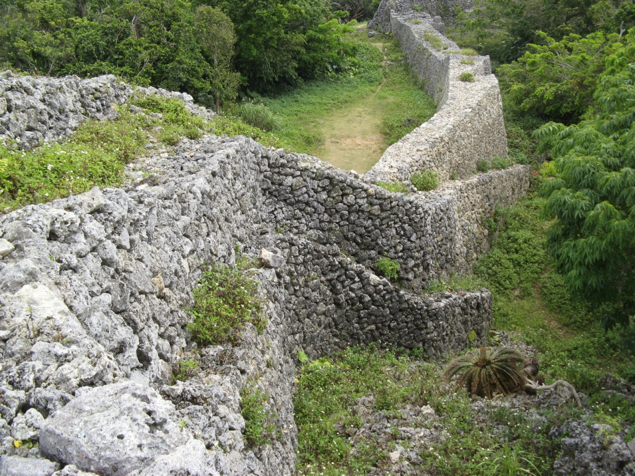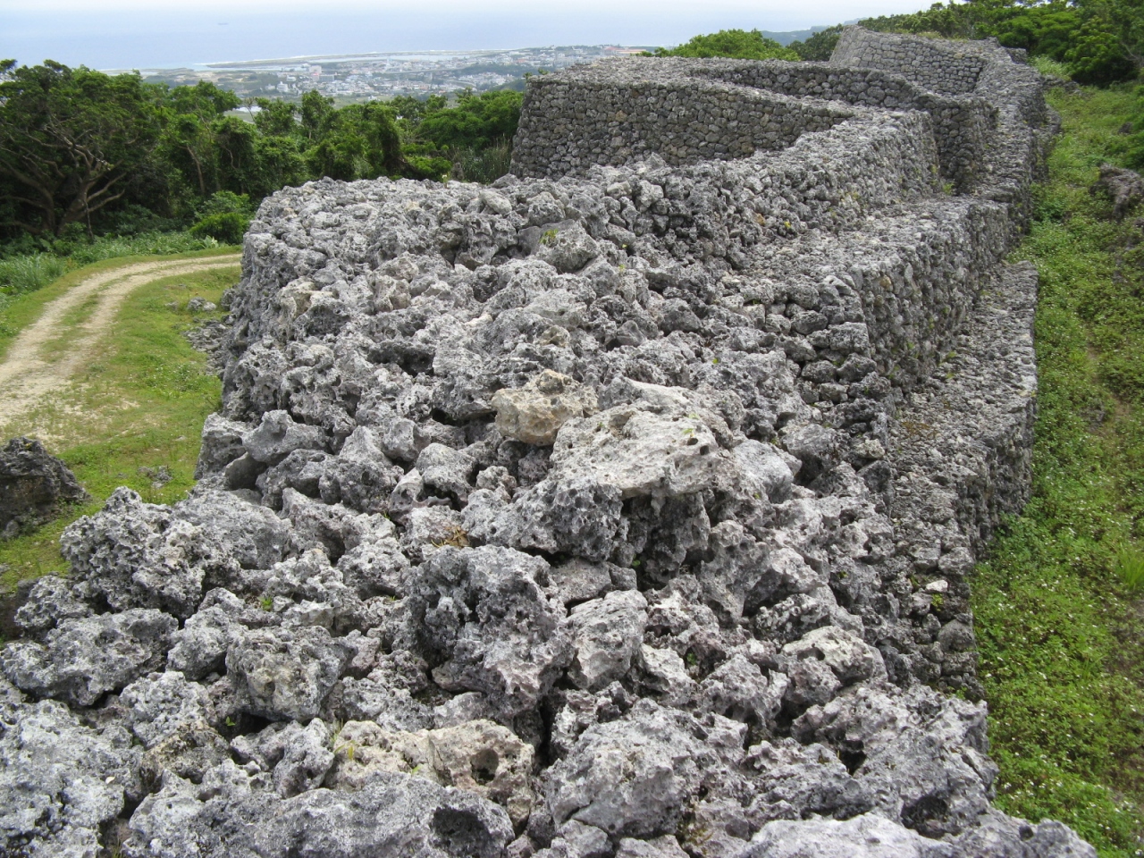 本島南部観光のときに「糸数城跡」に寄って来ました。場所は南城市玉城の県道48号線からわき道にはいった糸数村にあります。糸数村落南側の断崖上に築かれた古城で、現在は、琉球石灰岩で作られた石垣が残っている程度で、訪問したときも石垣の復元工事が行われていました。足場が悪いところですが、石垣の上に登るとわずかですが視界が開け、遠くに海が見えました。観光客がほとんど行かないような場所ですが、昔のグスク(城)を感じてみたい人にはお奨めします。