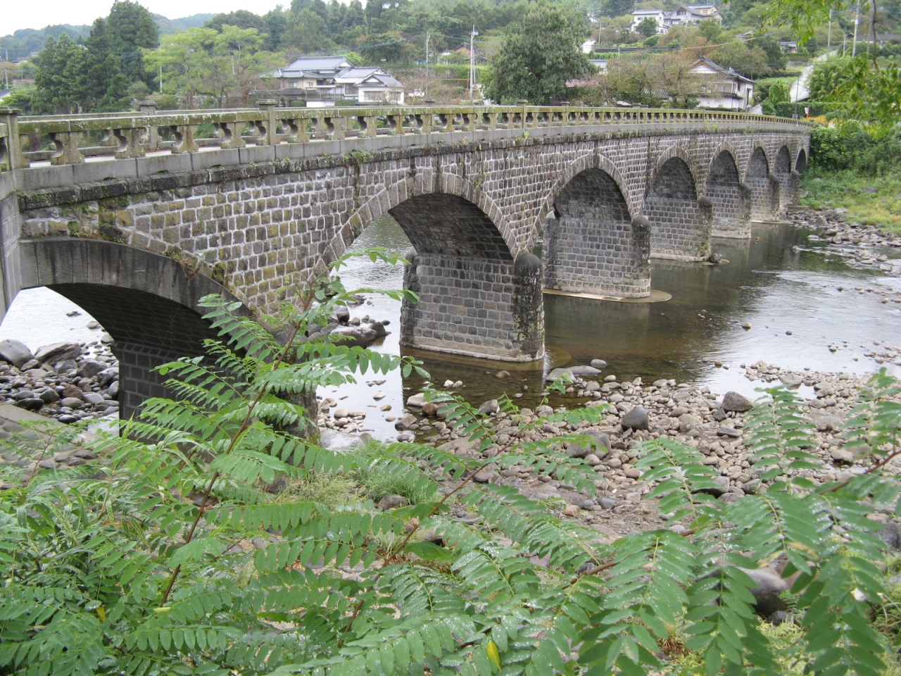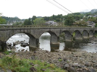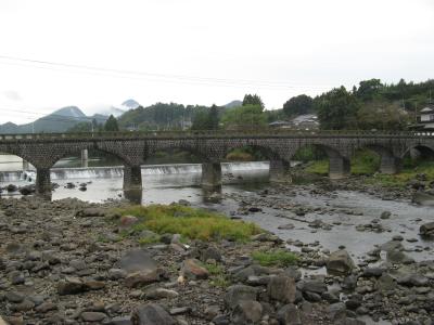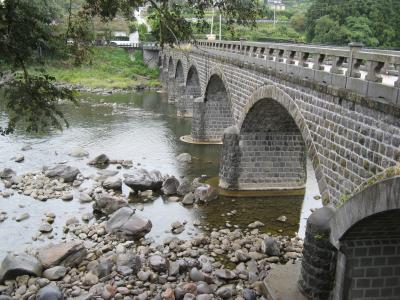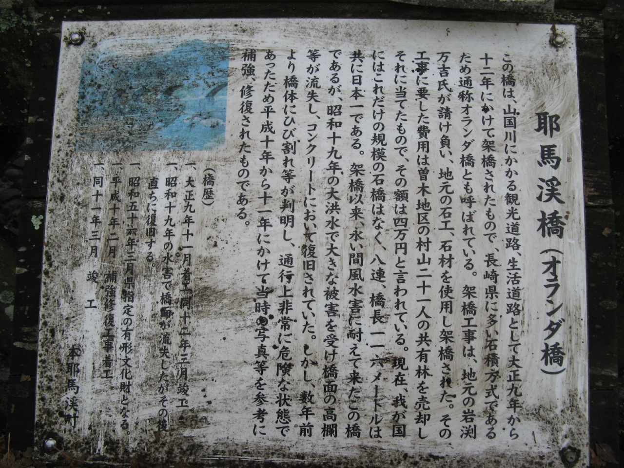 「耶馬溪橋」は観光地で有名な青の洞門の下流約500mに位置する石橋です。大正12年(1923年)に完成したこの橋は、石造作りの大橋(通称オランダ橋)で、我が国唯一の長崎式石積による8連アーチ橋です。この橋は長崎県に多い石積み方式であったため“オランダ橋”と呼ぶようになったそうです。山国川に架設された橋は全長116mあります。名勝耶馬渓の景観とあいまって独特の美しさを持っていました。