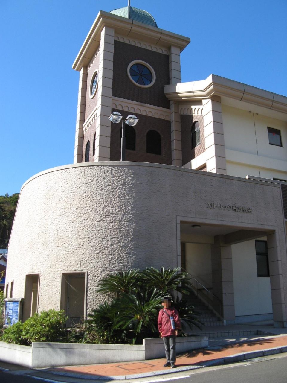 五島列島の教会巡りをした時に「桐教会」を訪れました。場所は、中通島の南の玄関口、奈良尾港から車で10分ほどの桐古里地区の小高い丘の上に立っていました。白壁と赤い屋根の高い尖塔を持つ教会は、90年余の歴史を刻み、若松瀬戸を往来する船舶の航海の安全を祈るかのように、丘の上から静かに見守っているようでした。境内には昭和46年に建立された、桐教会復活期の指導者、下村善七・ガスパル与作親子と清川沢次郎翁を顕彰する信仰先達者顕彰碑がありました。教会堂のある高台からは、美しい瀬戸を望むことができました。