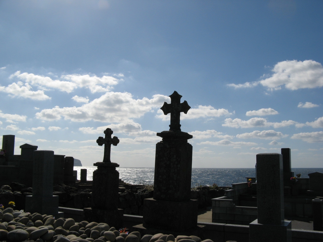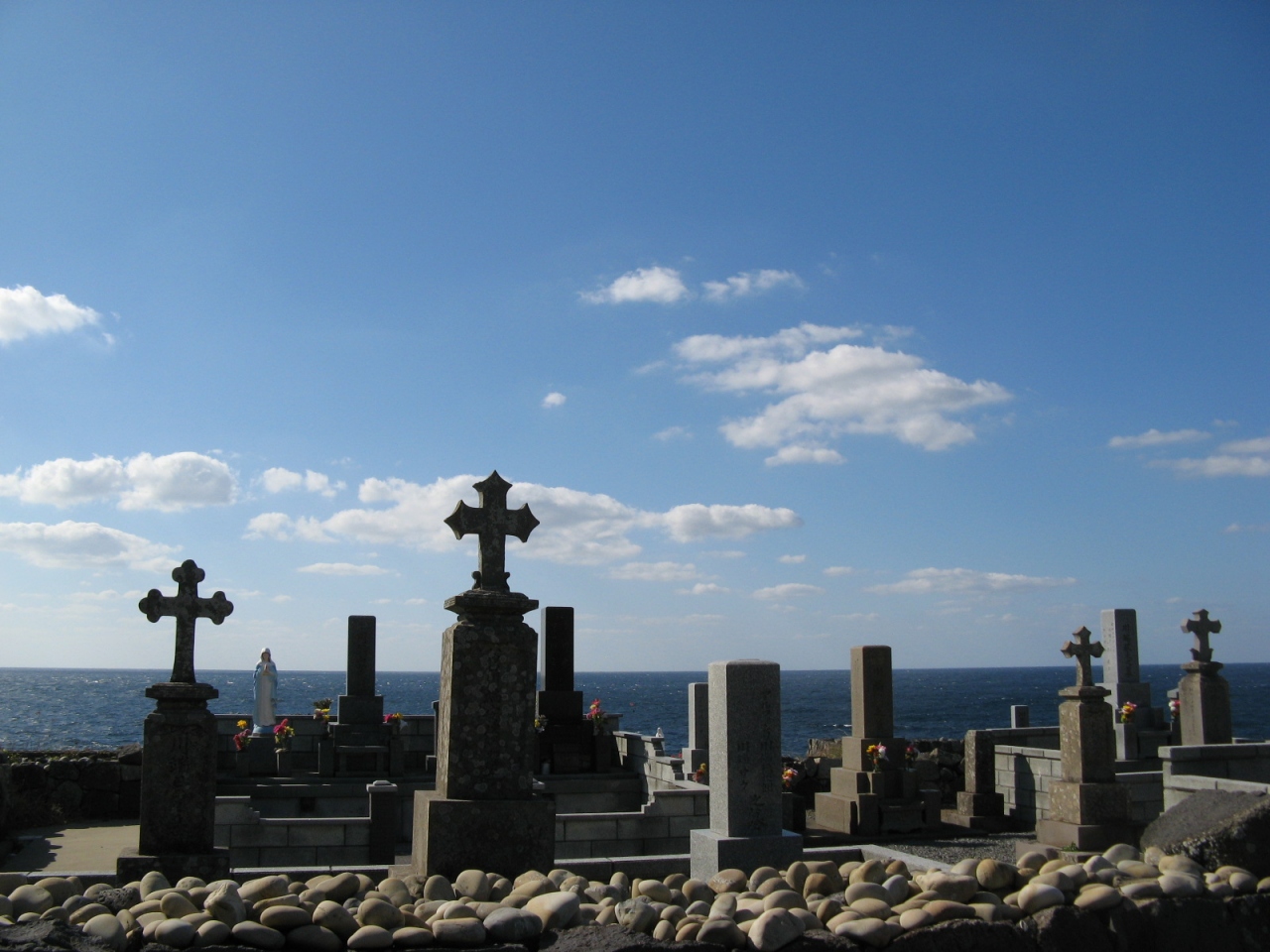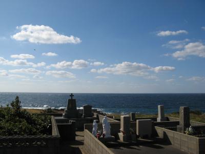 福江島を一周観光したときに「カトリック墓碑群」を訪れました。場所は、福江港より国道384号線を40分ほど走ると渕ノ元郷の集落に着きます。その集落の海辺に「カトリック墓碑群」はありました。日本の墓地にある石碑と同じ形状の墓石の上には十字架が乗っていました。天気が良かったこともあって、長崎鼻など東シナ海の絶景を背景にした、海辺の静かで小さな墓地からは、弾圧の中で強く生き延びた信者たちの歴史を感じることができました。わざわざ、観光に行くような場所ではありませんが、五島の教会巡礼をされる方には是非訪問されることをお奨めします。