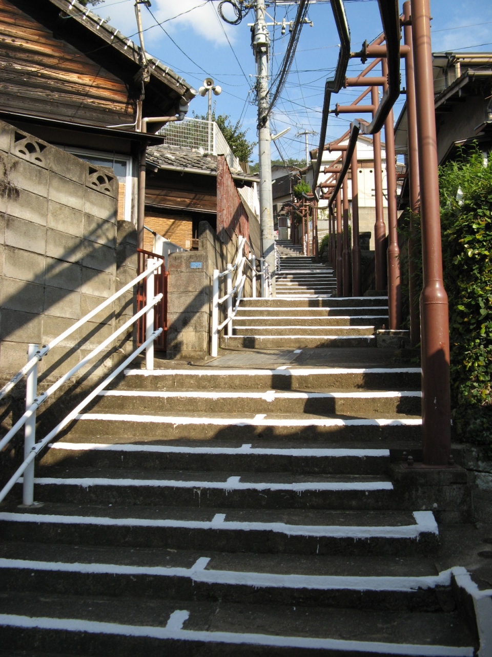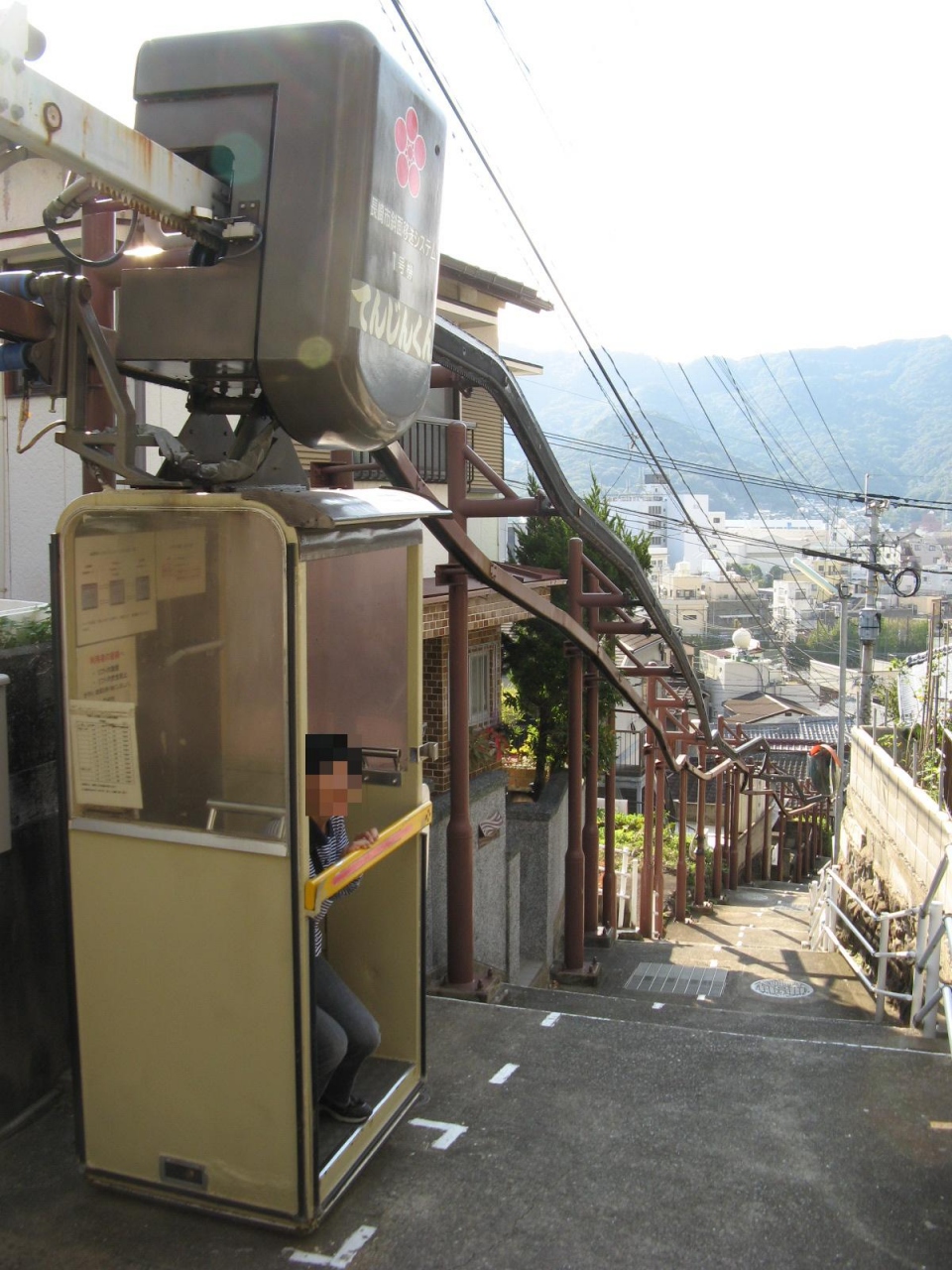 長崎市を観光したときに、前から興味のあった「長崎市斜面移送システム」を見に行きました。長崎市は地形的特性から市街地の約7割は斜面市街地で、しかも幅員が1mから2m程度の階段道路網を形成していることから、生活道路としての車道の整備はなかなか進んでいない状況です。そこで、主として高齢者を中心とした交通弱者が斜面道路を安全かつ快適に移動できる機器の研究・開発を目的として、「長崎市斜面移送システム」が進められており、現在市内5箇所に設置されています。狭い階段状の道路上に、軒すれすれに張り巡らされた、一人乗りのリフトの様な乗り物はこれまで見たことの無い、ユニークなものでした。