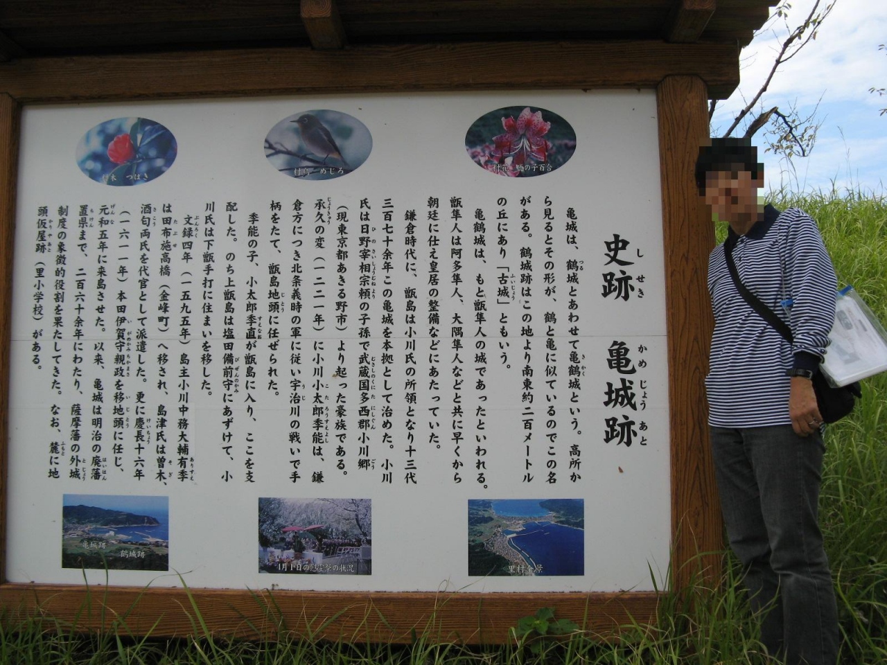 上甑島の里町にある「亀城跡」は、里港の入江の南部、小高い丘の上に残る城跡です。承久の乱(1221年)で戦功を残した鎌倉時代の武将小川氏の子孫、季直が地頭として島へ下り築城したものです。里小学校の横の道を登って行くと本丸跡に続く階段があります。城跡は公園として整備されており、僅かに残されている石垣のほかに当時の様子を偲ぶものは殆どありませんでした。標高も20~30mと低く、本丸跡からの景色もそれほどよいものではありませんでした。
