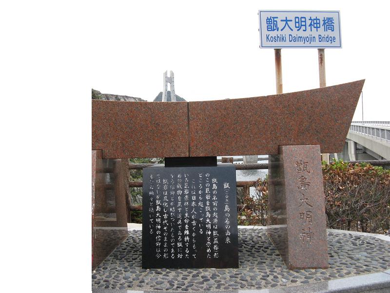 「甑大明神橋」は上甑島と中甑島の間のヘタノ串海峡に架かる橋で、全長420メートルの斜張橋です。上甑島の里港から県道348号線と県道351号線を走って10分あまりのところにあります。架橋地点のヘタノ串には、甑(せいろ)の形に似た大岩を御神体とする甑大明神が祭られており“甑島”地名の発祥地と言われています。この橋を渡るとすぐ、古代ローマ遺跡の水道橋の様な形の“鹿の子大橋”があります。わざわざ見に行く様なものではありませんが、周囲は絶景が続く場所なので近くに行ったら車を停めてご覧下さい。