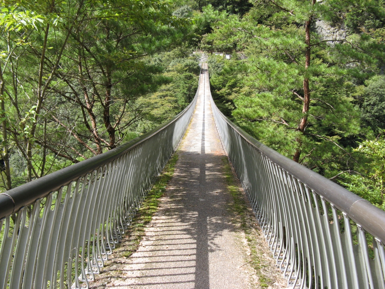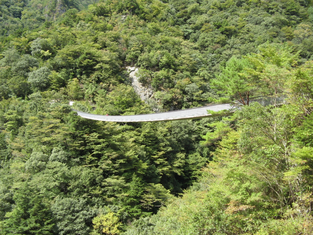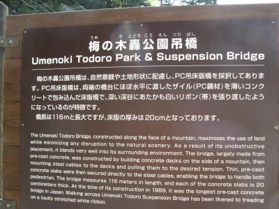 「梅の木轟公園吊橋」は国道445号線沿いに架かる五家荘最長の吊橋です。平成10年“梅の木轟の滝”へ渡るために造られたもので、橋長116m、高さ55mで上下の補助ロープや支柱を使わないPC吊床版橋です。橋の中央に立ってから谷底を覗くと足がすくむ程のスリルがありました。紅葉の季節には少し早かったですが、美しい渓谷美には満足しました。橋のたもとには売店や駐車場もありましたので、近くに寄られたら、是非、橋を渡られることをお奨めします。