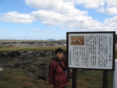 五島の福江島を一周観光したときに、「カグラサン」を訪ねました。場所は福江島の西北、三井楽町の柏崎にあります。ここは江戸時代に大規模な捕鯨基地だったそうで、そのときの鯨の陸揚げや解体に用いられていたロクロ場の跡が「カグラサン」で、黒い溶岩の様な大きな石が直径10mぐらいにわたって残されていました。「カグラサン」は神楽桟と書き、 鯨を解体する現場が神楽を舞うときのような様子から呼ばれるようになったという説があるそうです。