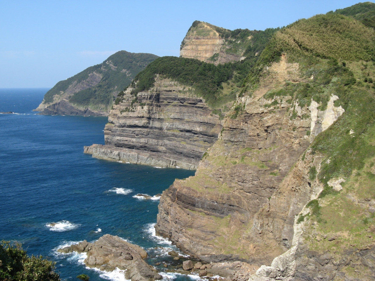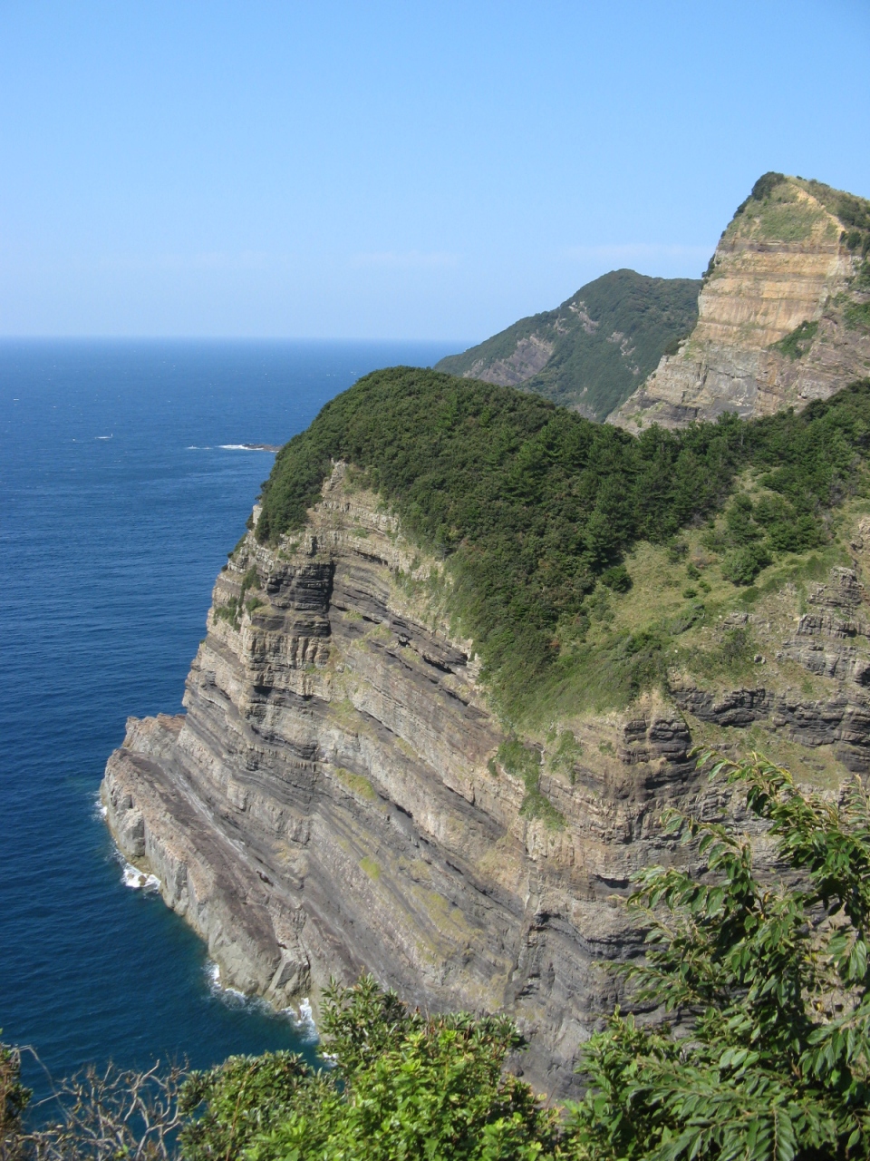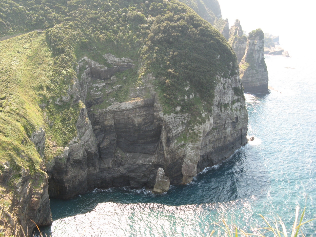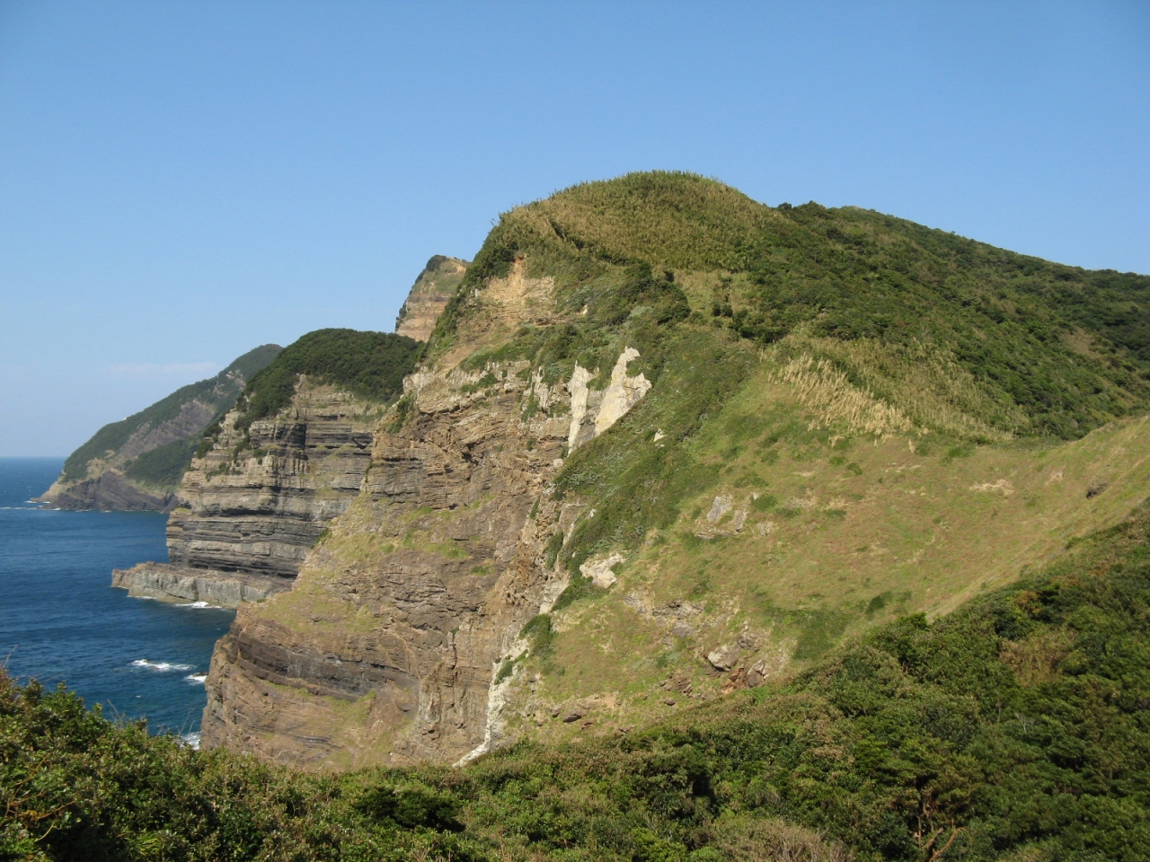 下甑島一周旅行のときに、「鹿島断崖」を訪れました。場所は、鹿島港フェリー桟橋より車で西に約5分、駐車場から歩いて10分足らずで、断崖の見える場所に到着します。「鹿島断崖」は、高さ150mの横縞模様の層を持つ荒々しい断崖でした。天気が良かったので、吸い込まれそうな海の色、縞模様の岩肌、崖の緑、青い空と見事なコントラストを楽しむことが出来ました。訪れたのが10月だったため、この辺り一体に咲くハマカンゾウの群生を見られなかったのが唯一残念なことでした。下甑島に行かれて天気が良ければ、是非、訪れられることをお奨めします。