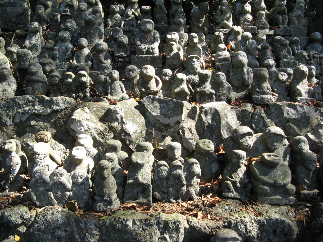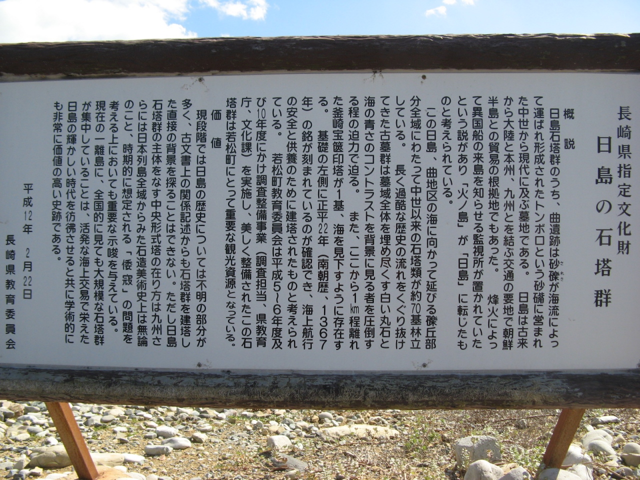 五島列島の教会巡りをした時に「日島の石塔群」を訪れました。場所は、新上五島町の日島というところで、奈良尾港から国道384号線を走って、県道46号線から若松大橋を渡り、県道169号線を終点まで走って有福島から渡ってすぐの曲崎海岸にあります。東シナ海を望む海岸に五輪塔などが数十基林立していました。現地の説明板によると『離島に全国的に見ても大規模な石塔群が集中していることは、活発な海上交易で栄えた日島の輝かしい時代を髣髴させると共に、学術的にも非常に価値が高い史跡である。』とありました。観光に行くようなところではありませんが、五島の歴史に興味のある方にお奨めします。