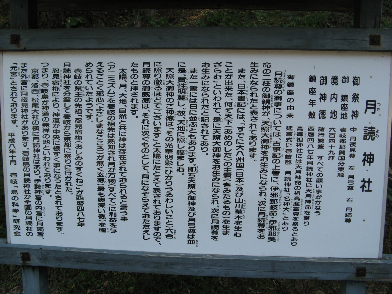 壱岐島の東北の玄関口、芦辺港から西へ県道172号線を約2?走ったところに、「月読神社」があります。県道の脇に鳥居や由緒書きがあり、そこから桧林の中の急な50〜60段の石段を上がると狭い境内に社殿がありました。由緒書きによると『古事記では伊邪那岐命(いざなぎのみこと)と伊邪那美命(いざなみのみこと)が天照大御神の次に産んだのが月読命(つくよみのみこと)とされており、西暦487年に月読命をお祭した。月読神社が全国の月読社の“元宮”。』と言うことでした。鬱蒼として昼なお暗く神秘的なたたずまいの神社でした。古代史に興味のある方は参拝してください。