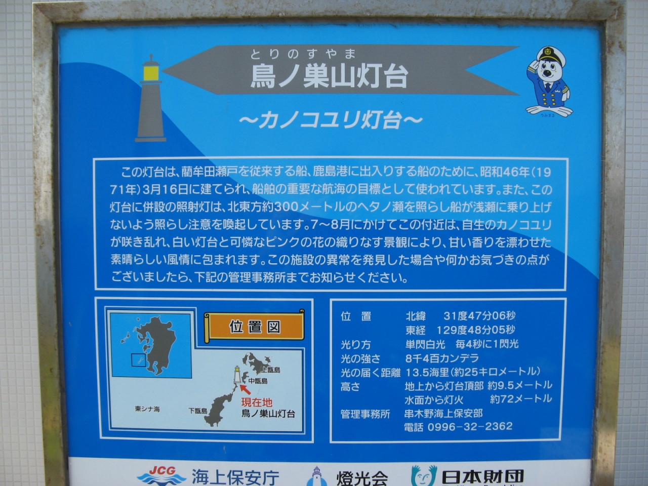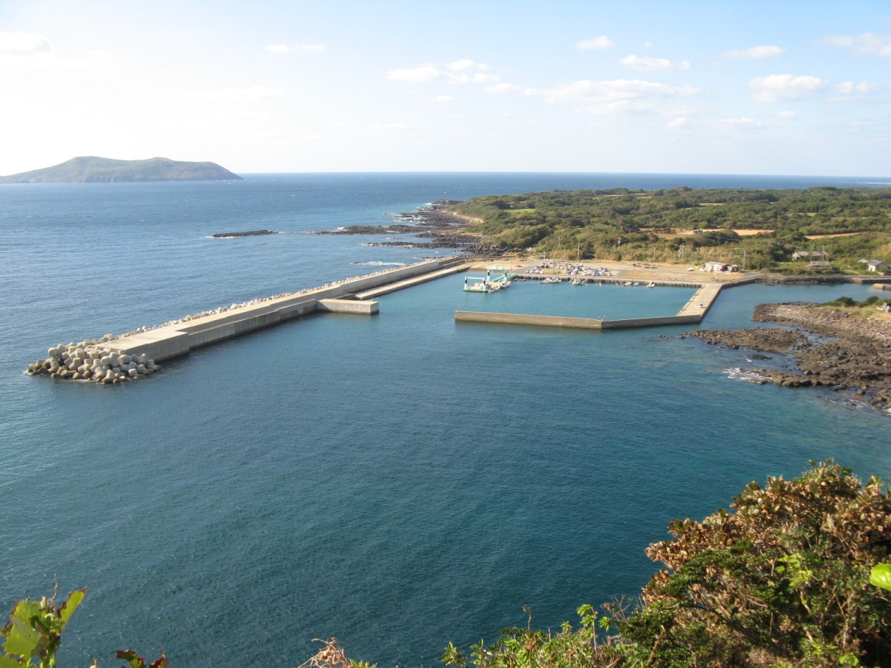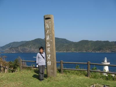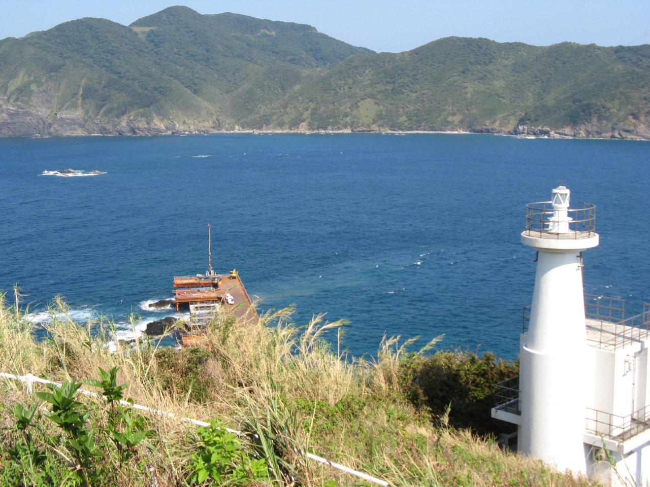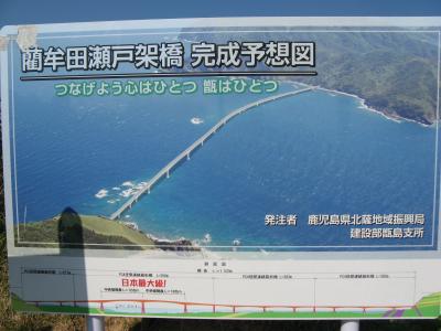 「鳥ノ巣山展望台」は鹿島港から県道349号線を北へ車で約5分、下甑島の北の端、平瀬崎にあります。藺牟田瀬戸海峡を挟んで中甑島が見渡せる展望台です。現在、この海峡に橋をかける工事が始まっており、2010年代には橋長約1.5?の夢の大橋仮称『藺牟田瀬戸架橋』が完成する予定で、「鳥の巣山展望台」から海峡の絶景と共に、その工事の状況がよく見えました。なお、この周辺はハマカンゾウの自生地としても知られ、7月から9月初めまで美しい群生が見られるそうですが、訪れたのが10月だったので、残念ながら見ることは出来ませんでした。