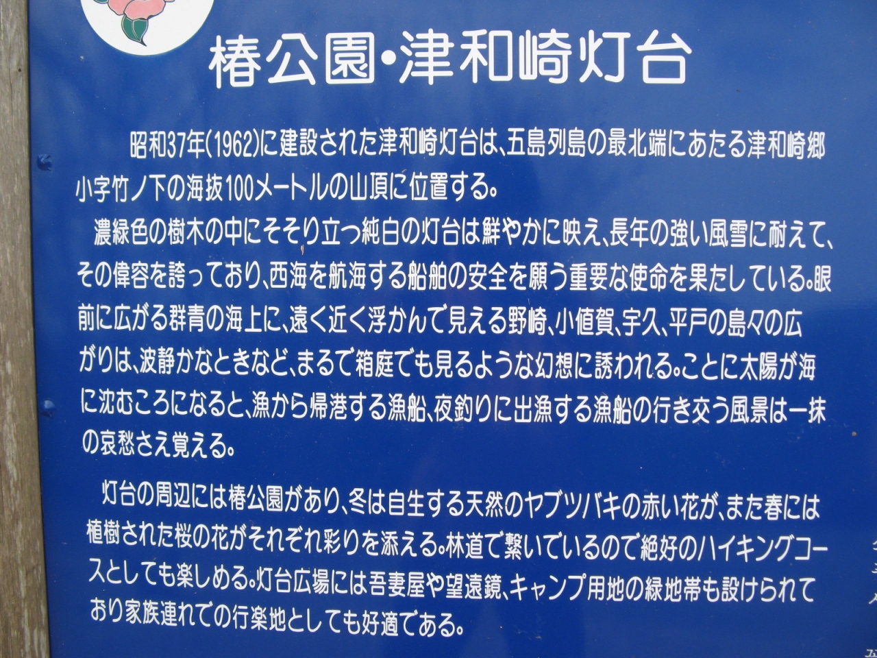 「津和崎灯台」は、五島列島の中通島の最北端の津和崎の海抜100mの山頂にあります。中通島の玄関口、有川港から県道32号線と218号線を車で北上すること1時間ほどで到着しました。昭和37年(1962)に建設された「津和崎灯台」の周囲は椿公園として整備されていました。ここから見える野崎島や小値賀島、宇久島などの島々の広がりは箱庭を見るような美しさでした。アクセスは悪いですが、天気が良いときに五島の教会巡りをしたときなどには是非散策されることをお奨めします。
