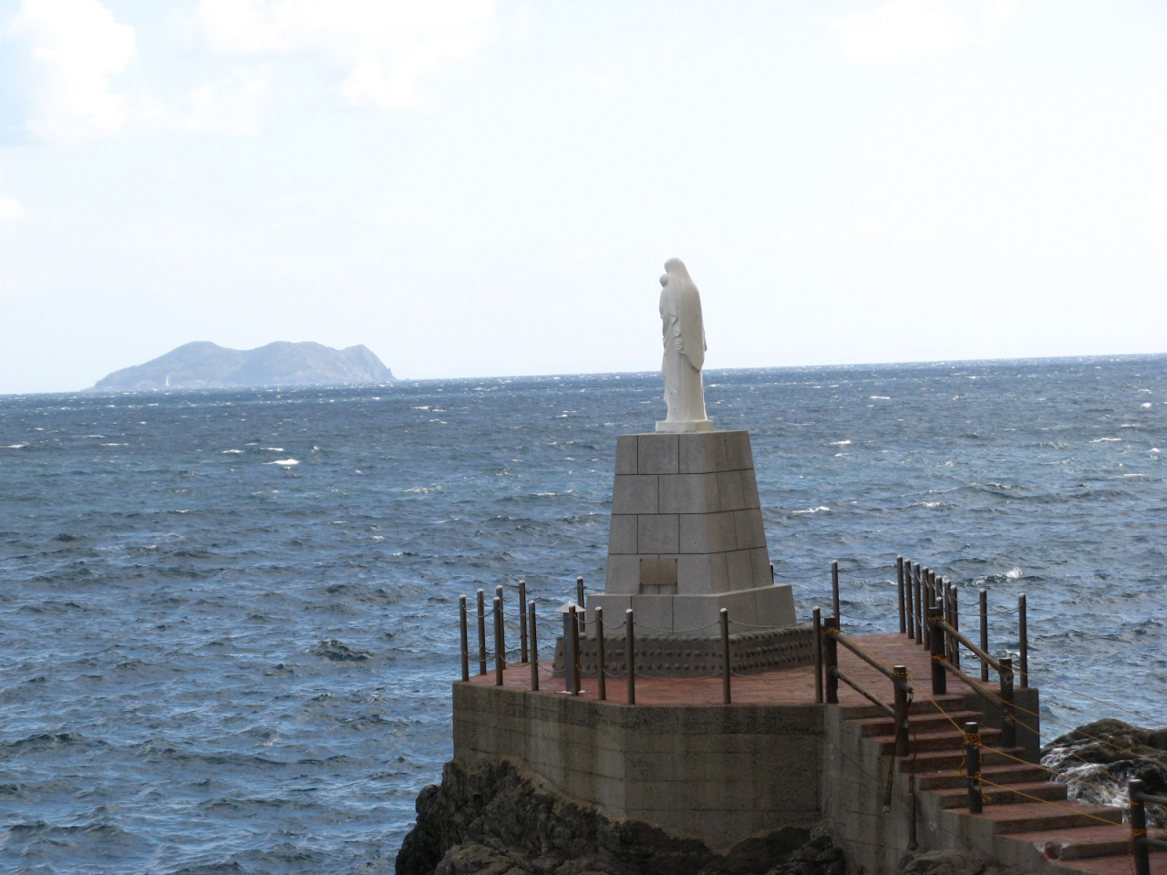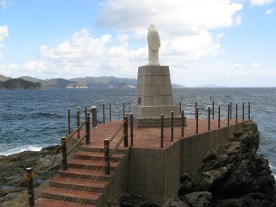 上五島の教会巡りをした時に「希望の聖母像」を訪問しました。場所は、中通島の玄関口である奈良尾港から国道384号線、県道22号線を車でおよそ20分、岩瀬浦集落の東の端の浜串という海に面したところです。浜串は、カトリック信徒の集まる漁村です。その漁港の入り口近く、海に突き出した岩場の上に、白いマリア像がありました。航海の安全と大漁を願って建てられたものらしく、優しく海を見つめているマリア像を見ていると、この地の人々の信仰の深さを知ることが出来ました。