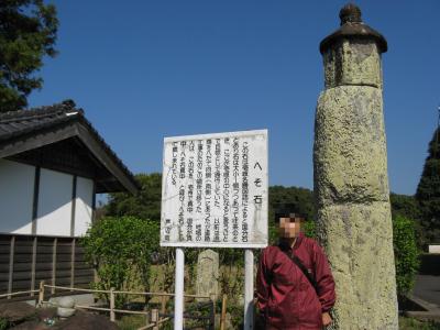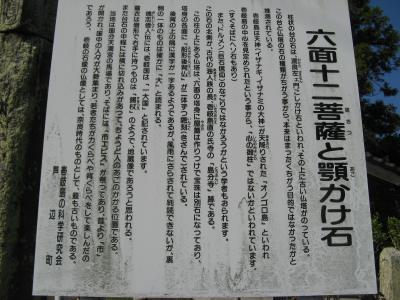 壱岐島の東北の玄関口、芦辺港から西へ県道172、174号線を約4?走った県道脇に、「へそ石と顎掛け石」があります。“へそ石”は竹の柵で囲まれた大小2個の石でした。『壱岐名勝図誌』には国分石とあり、壱岐の中心の道標にしていたことから、壱岐のど真ん中と言うことで“へそ石”と呼ばれているそうです。その隣に立つ石柱が、“顎掛け石”で、上部に六面十二菩薩の仏塔が乗っています。壱岐島の中心を定めた心(しん)の御柱(みはしら)であるとか、あるいはドルメン(巨石信仰)ともいわれており、由緒ははっきりしないようです。柱の中ほどにちょうど大人の顎が掛かるくらいの位置に、刻み目があり、これが普通の人の顎の位置で、人々はここに顎を掛けては背の高さを自慢したことからこの名が付いたようです。