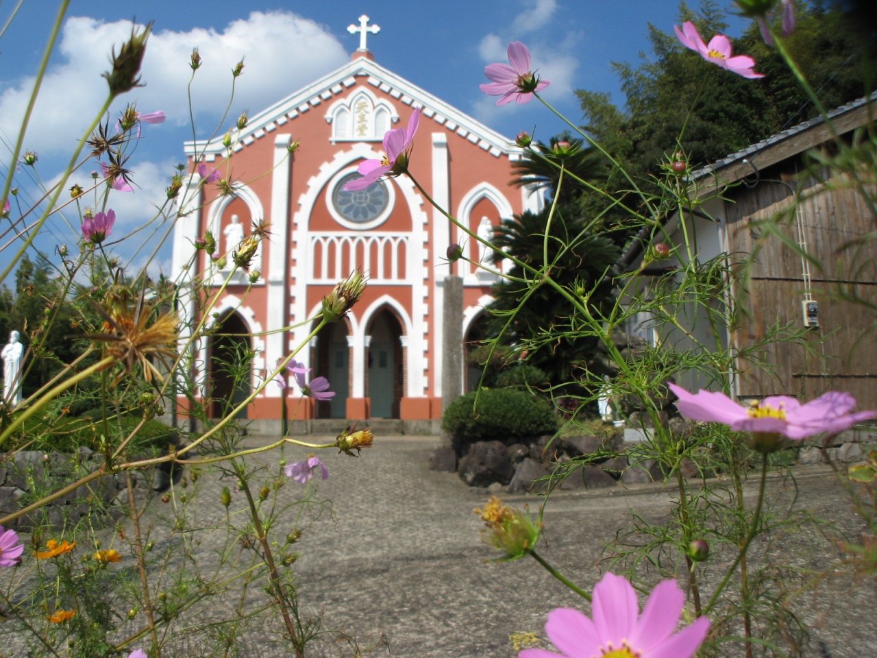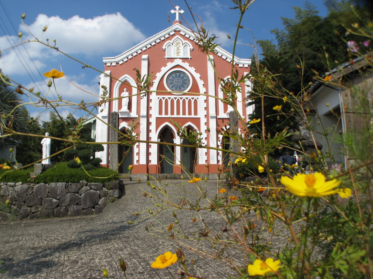平戸から国道383号線を車で30分足らず、宝亀町の海を見下ろす高台に「宝亀教会」があります。1898年建築という古い教会で、建物は木造切妻、単層屋根構成、瓦葺きで、外壁は下見板張りで、建物正面の玄関部分のみ1間が煉瓦造となっています。