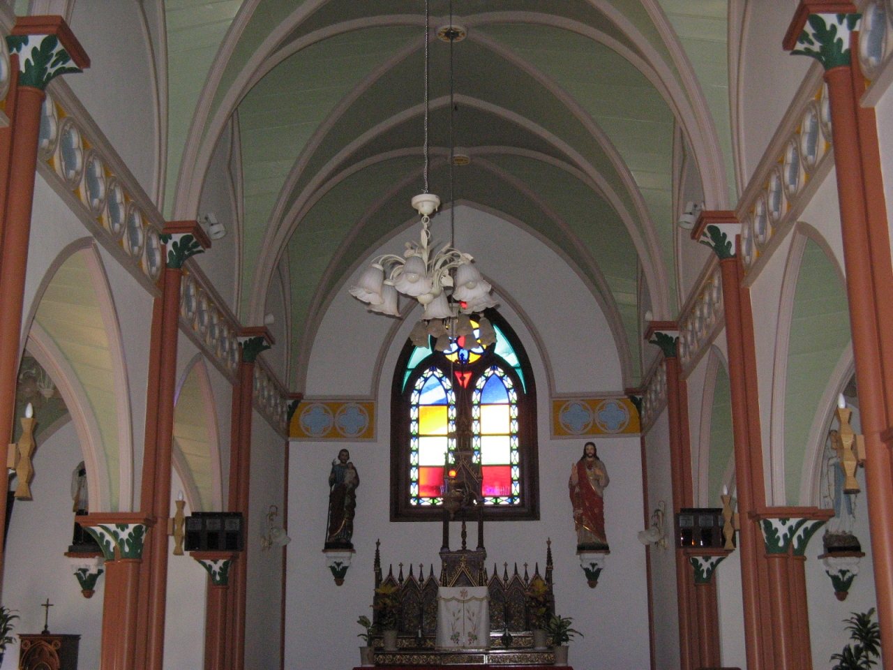 平戸の町から県道19号線を走って20分足らず、生月島にかかる生月大橋を渡ってしばらくしたら「山田カトリック教会」に到着します。教会は九州の教会建設の第一人者である鉄川与助氏の設計により1912年に完成したものです。それほど大きくない教会で、外観は地味ですが、内部の壁の装飾は蝶の羽根を使った絵が描かれていたり、ステンドグラスなども大変綺麗なものでした。観光地化していない教会で、中に入るとシーンとした厳かな雰囲気に包まれます。キリシタン教会巡りをする方にはお奨めします。