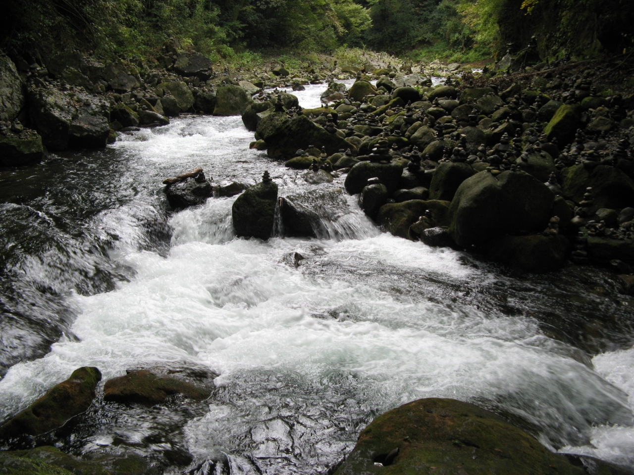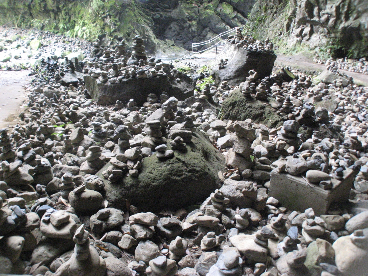 宮崎県の高千穂町にある天照大御神がお隠れになったという天岩戸が祭られた天岩戸神社。その天岩戸神社の裏参道より「天安河原」まではゆっくり歩いて10分程度。渓流沿いの木々に囲まれた歩道はとても気持ちが良い道です。渓流の河原にふと目をやると、石が積んである光景に出会います。さらに奥へと歩くと、大きな洞窟があり、周りにたくさんの石積みがあり、奥にはお社もあります。天照大神が天岩戸にお隠れになった際にここの川原に神々が集まって相談をしたとの言い伝えが残っている所です。日本一のパワースポットと呼ばれていることが感じられる、何か一種独特の雰囲気を持った場所でした。