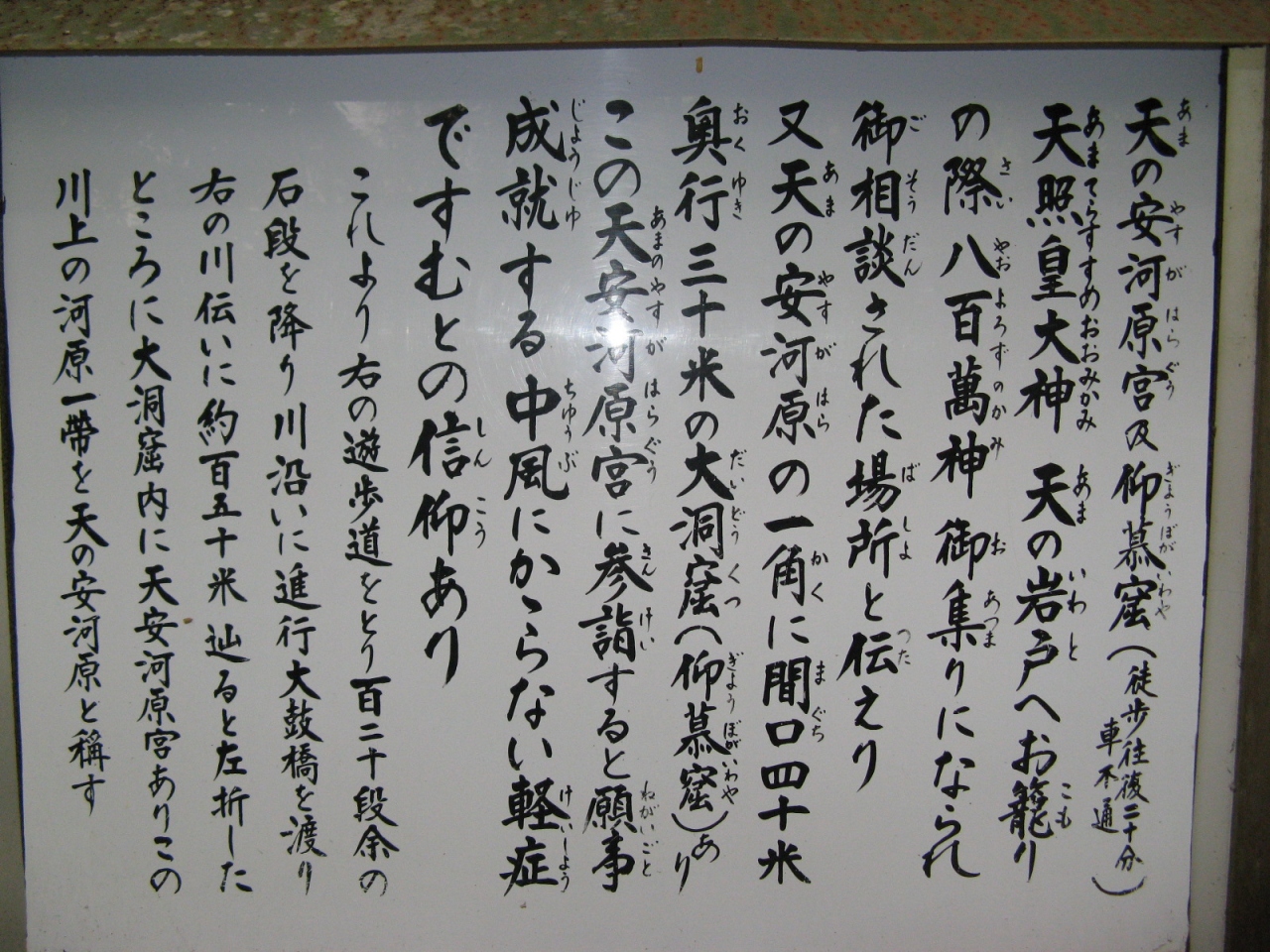 社務所で申し込みをして宮司さんに“天岩戸”を岩戸川の対岸から案内・説明(所要時間約20分、無料)して頂きました。昔は洞窟だったようですが、今は窪みのようになり、生い茂る木に隠れてどんな形かわからなかったですが、厳かな雰囲気の中で心身ともに洗われたような気がしました。なお、ご神体の撮影は禁じられています。