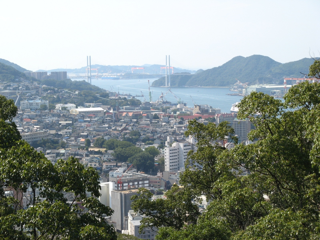 竜馬通りを上った坂の途中に、“亀山社中跡”の記念碑が立っています。そこから少ししんどかったですが、坂道と階段を15分ほど歩くと「風頭公園」に着きました。長崎の町を見渡せる高台の上にあり、ここにも龍馬像がありました。豪快に腕組みをして威厳たっぷりに長崎の町を見渡しています。本当に竜馬もこの様な姿で世界を見つめ、考えていたのでしょう、と、思わせるカッコイイ姿でした。