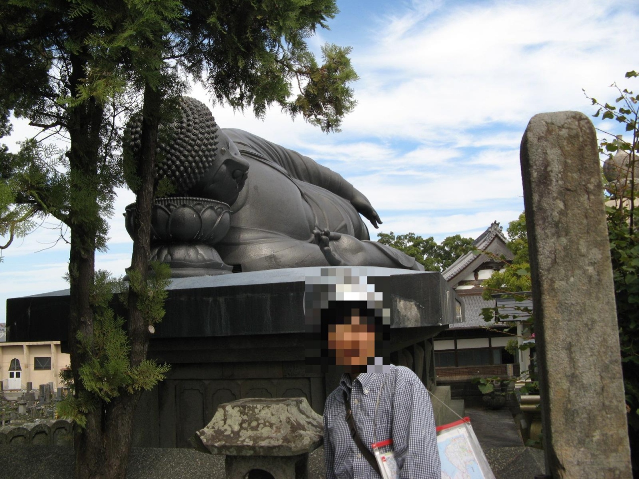 九州一周旅行のときに訪れました。「江東寺」は曹洞宗のお寺で山号は清光山。島原市のアーケード街から直接行けます。アーケードから山門をくぐって江東寺本堂の前に出ると、向かって左手眉山をバックに涅槃像が見えます。この涅槃像は島原の乱の原城総攻撃で戦死した幕府軍の総帥である板倉重昌を追善しようと、昭和32年12月この地に建立されたもので、像の全長は8.6m、高さ2.12mもあり、鉄筋コンクリート造りの涅槃像としては日本最大とのことでした。周りにはお墓があり、観光客があまり行くようなところではありませんでしたが、島原の乱など歴史に興味のある方はどうぞ。